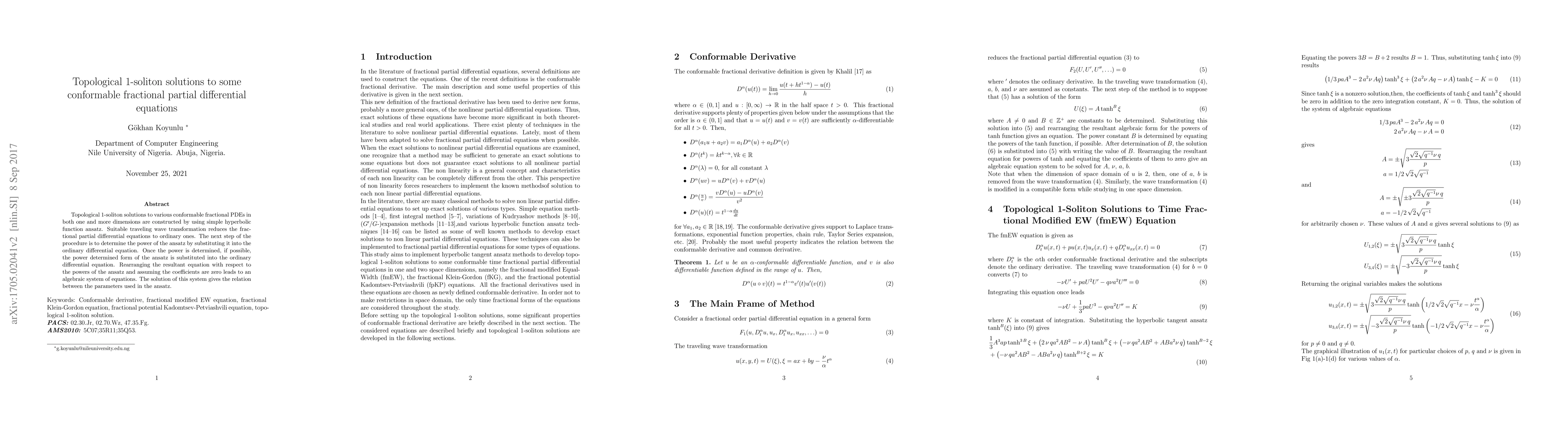 This paper constructs topological 1-soliton solutions for conformable fractional partial differential equations using hyperbolic function ansatz and traveling wave transformations. The method reduces the fractional PDEs to ordinary ones, allowing for the determination of ansatz parameters through algebraic systems derived from the ordinary differential equations.