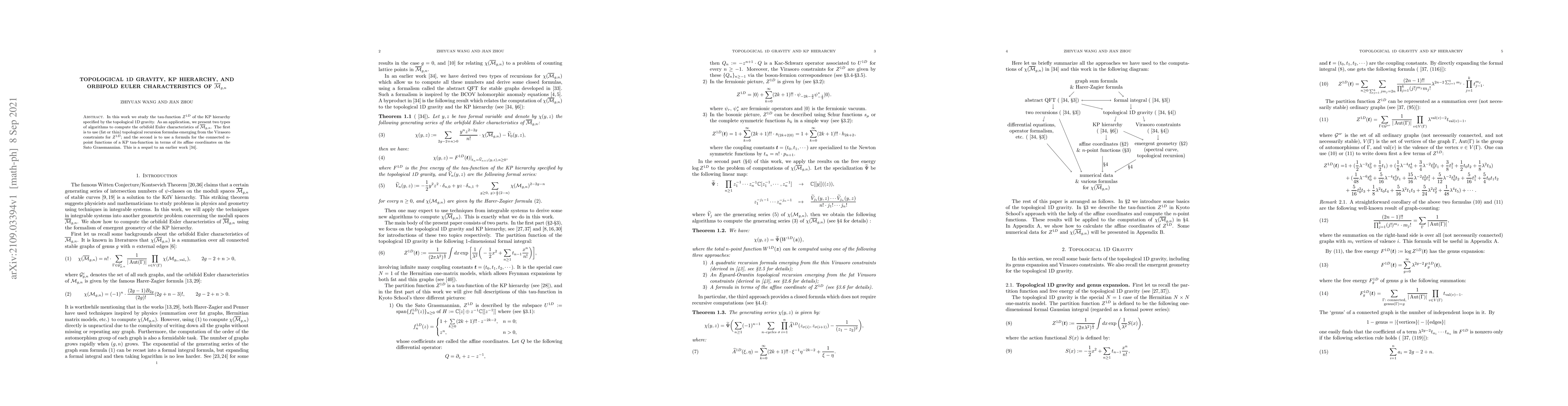 This paper examines the tau-function $Z^{1D}$ of the KP hierarchy in topological 1D gravity, and develops algorithms for calculating orbifold Euler characteristics of $\overline{\mathcal M}_{g,n}$, using topological recursion formulas and connected $n$-point functions on the Sato Grassmannian.
