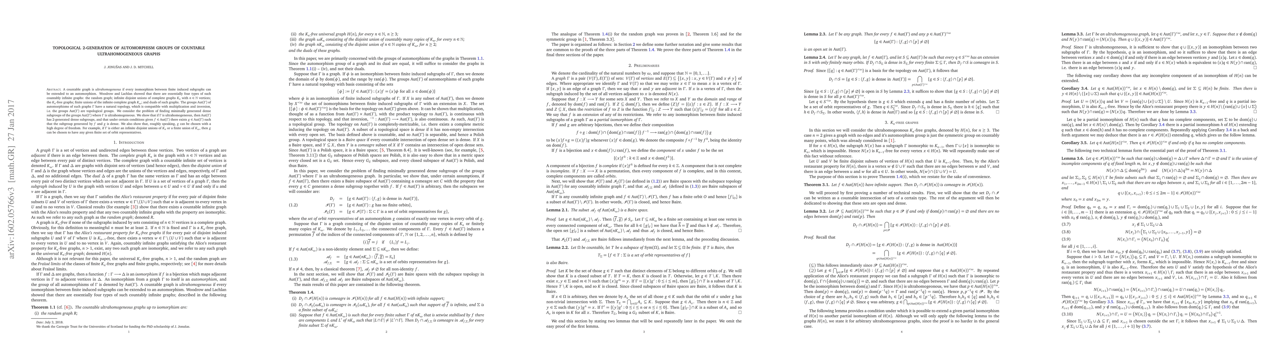 This paper explores the topological generation of automorphism groups of countable ultrahomogeneous graphs, demonstrating that these groups possess 2-generated dense subgroups. It also shows that under specific conditions, any given automorphism can be extended to a dense subgroup with a high degree of freedom, particularly in cases involving infinite unions of complete graphs or their unions.