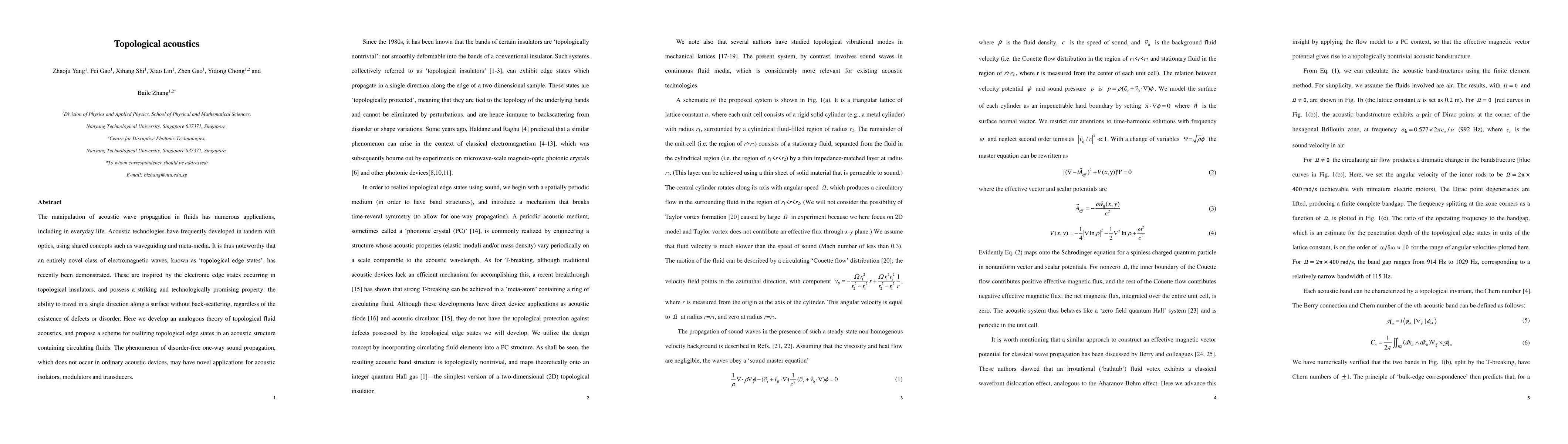 This paper proposes a theory of topological fluid acoustics and introduces the concept of topological edge states in acoustics, akin to topological edge states in electromagnetic waves. It suggests a scheme to realize these states in fluid structures, enabling one-way sound propagation without backscattering, potentially revolutionizing acoustic devices such as isolators, modulators, and transducers.