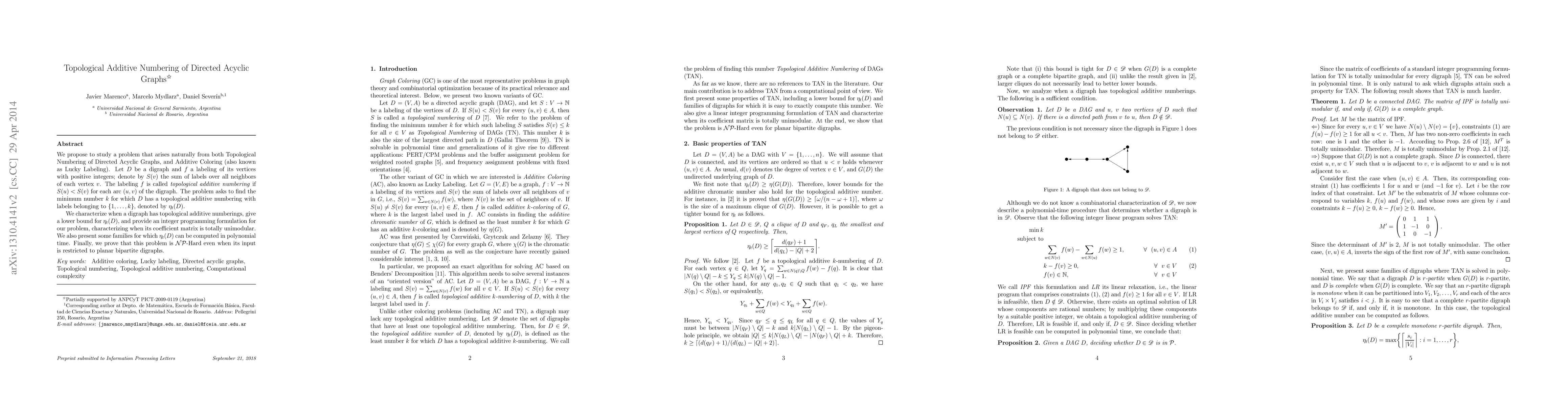 The research proposes a topological additive numbering problem for directed acyclic graphs (DAGs), characterizing when a digraph has such numberings, providing a lower bound for ηt(D), and presenting families of digraphs for which ηt(D) can be computed in polynomial time. It also proves that the problem is NP-Hard even for planar bipartite digraphs.