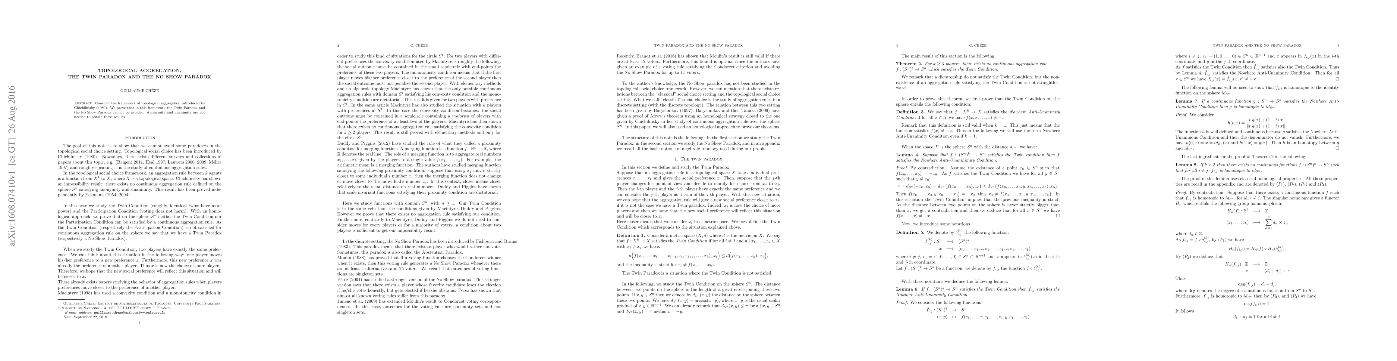 Summary: This paper demonstrates that within the topological aggregation framework, the Twin Paradox and the No Show Paradox are inevitable, regardless of anonymity and unanimity. Chichilnisky's (1980) framework cannot escape these paradoxical outcomes.