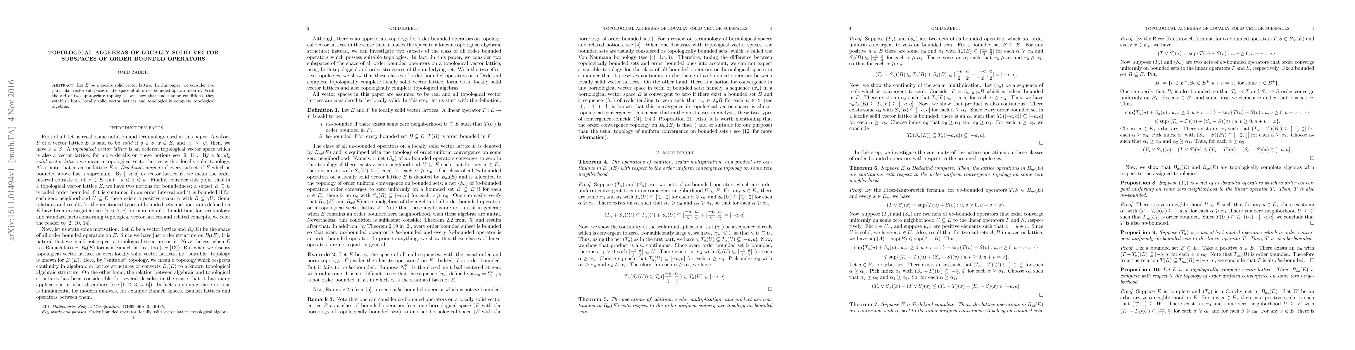 This paper examines two specific subspaces within the space of order bounded operators on a locally solid vector lattice E, demonstrating that they form both locally solid vector lattices and topologically complete topological algebras under certain conditions, using two suitable topologies.