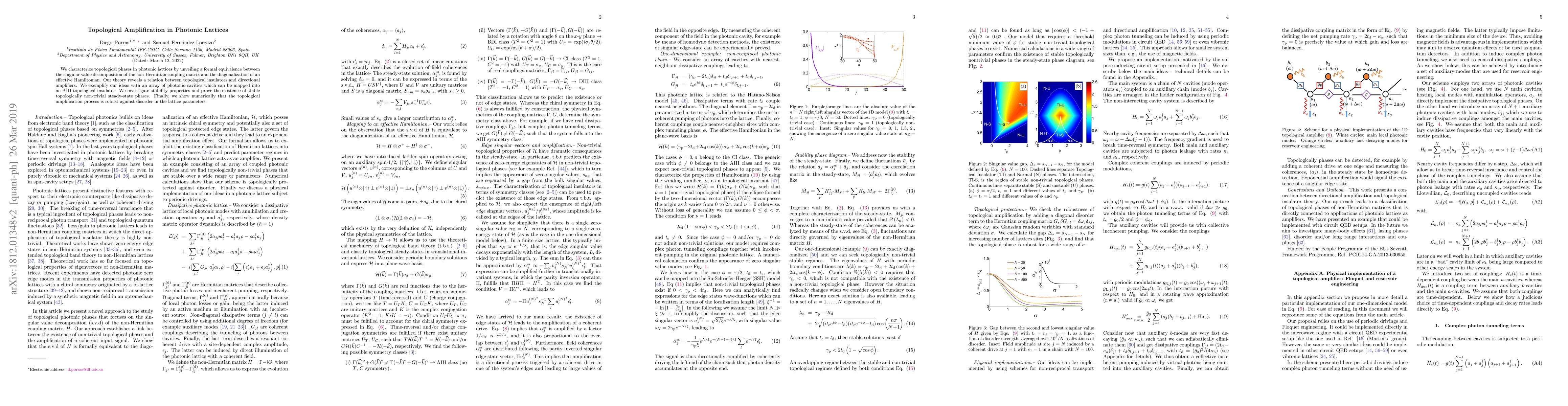 This paper characterizes topological phases in photonic lattices, establishing a connection between singular value decomposition and effective Hamiltonians to describe quantum amplification. It demonstrates stability and robustness of topologically non-trivial steady-state phases against disorder in photonic cavity arrays.