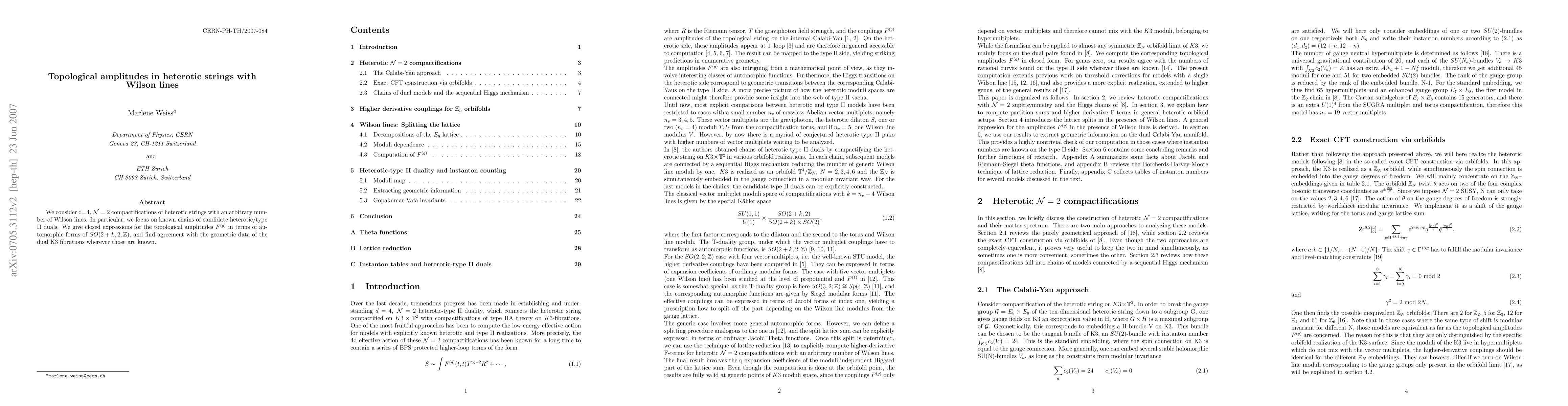 This paper derives closed expressions for topological amplitudes in d=4, N=2 compactifications of heterotic strings with Wilson lines, using automorphic forms, and confirms these results with known dual K3 fibration data.
