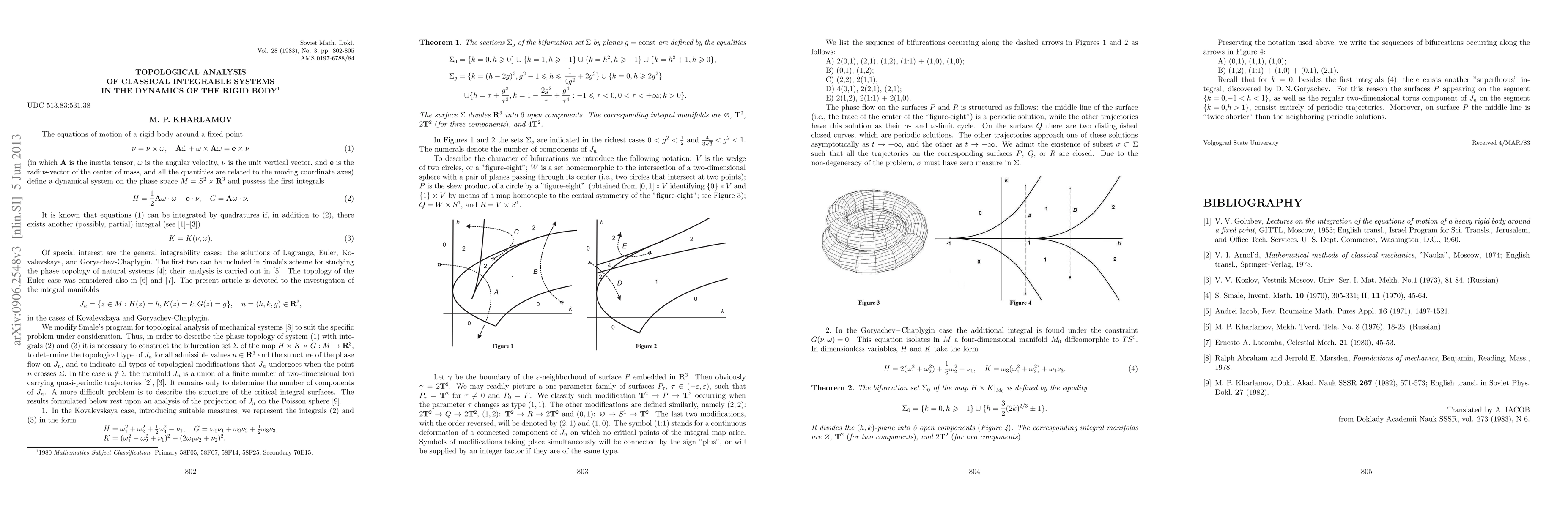 This paper analyzes the topological dynamics of classical integrable systems in rigid-body motion, focusing on the Lagrange and Euler cases, and extending Smale's scheme to the more complex Kovalevskaya and Goryachev-Chaplygin cases. It identifies bifurcation sets and classifies transformations of integral tori, revealing new non-trivial bifurcations in the latter two cases.