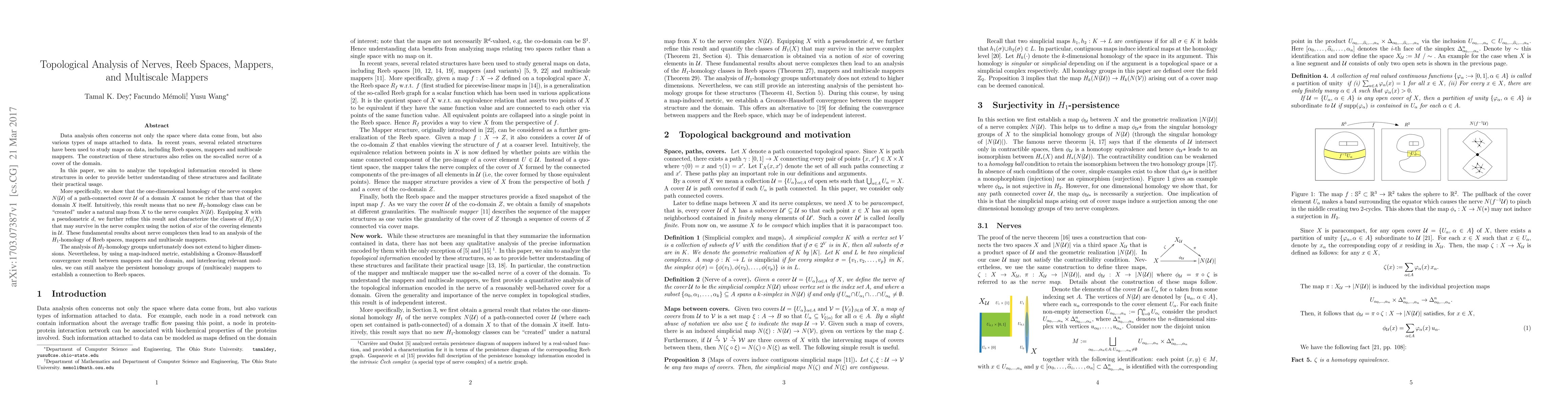 Data analysis often concerns not only the space where data come from, but also various types of maps attached to data. In recent years, several related structures have been used to study maps on data, including Reeb spaces, mappers and multiscale mappers. The construction of these structures also relies on the so-called \emph{nerve} of a cover of the domain. In this paper, we aim to analyze the topological information encoded in these structures in order to provide better understanding of these structures and facilitate their practical usage. More specifically, we show that the one-dimensional homology of the nerve complex $N(\mathcal{U})$ of a path-connected cover $\mathcal{U}$ of a domain $X$ cannot be richer than that of the domain $X$ itself. Intuitively, this result means that no new $H_1$-homology class can be "created" under a natural map from $X$ to the nerve complex $N(\mathcal{U})$. Equipping $X$ with a pseudometric $d$, we further refine this result and characterize the classes of $H_1(X)$ that may survive in the nerve complex using the notion of \emph{size} of the covering elements in $\mathcal{U}$. These fundamental results about nerve complexes then lead to an analysis of the $H_1$-homology of Reeb spaces, mappers and multiscale mappers. The analysis of $H_1$-homology groups unfortunately does not extend to higher dimensions. Nevertheless, by using a map-induced metric, establishing a Gromov-Hausdorff convergence result between mappers and the domain, and interleaving relevant modules, we can still analyze the persistent homology groups of (multiscale) mappers to establish a connection to Reeb spaces.