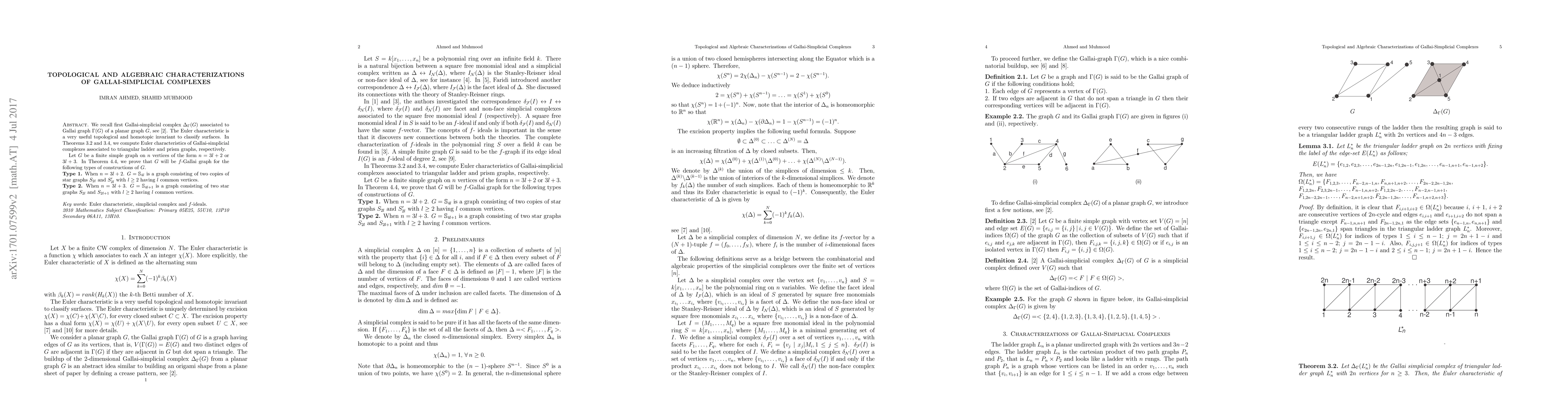 We recall first Gallai-simplicial complex $\Delta_{\Gamma}(G)$ associated to Gallai graph $\Gamma(G)$ of a planar graph $G$. The Euler characteristic is a very useful topological and homotopic invariant to classify surfaces. In Theorems 3.2 and 3.4, we compute Euler characteristics of Gallai-simplicial complexes associated to triangular ladder and prism graphs, respectively. Let $G$ be a finite simple graph on $n$ vertices of the form $n=3l+2$ or $3l+3$. In Theorem 4.4, we prove that $G$ will be $f$-Gallai graph for the following types of constructions of $G$. Type 1. When $n=3l+2$. $G=\mathbb{S}_{4l}$ is a graph consisting of two copies of star graphs $S_{2l}$ and $S'_{2l}$ with $l\geq 2$ having $l$ common vertices. Type 2. When $n=3l+3$. $G=\mathbb{S}_{4l+1}$ is a graph consisting of two star graphs $S_{2l}$ and $S_{2l+1}$ with $l\geq 2$ having $l$ common vertices.
