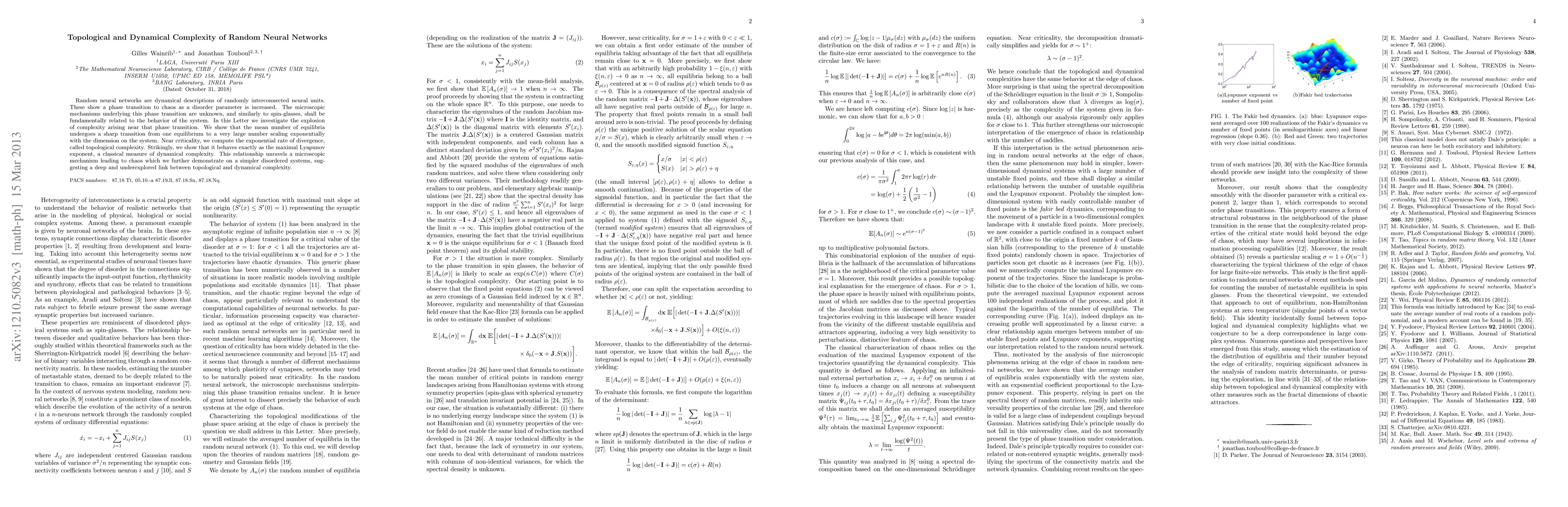 Random neural networks are dynamical descriptions of randomly interconnected neural units. These show a phase transition to chaos as a disorder parameter is increased. The microscopic mechanisms underlying this phase transition are unknown, and similarly to spin-glasses, shall be fundamentally related to the behavior of the system. In this Letter we investigate the explosion of complexity arising near that phase transition. We show that the mean number of equilibria undergoes a sharp transition from one equilibrium to a very large number scaling exponentially with the dimension on the system. Near criticality, we compute the exponential rate of divergence, called topological complexity. Strikingly, we show that it behaves exactly as the maximal Lyapunov exponent, a classical measure of dynamical complexity. This relationship unravels a microscopic mechanism leading to chaos which we further demonstrate on a simpler class of disordered systems, suggesting a deep and underexplored link between topological and dynamical complexity.