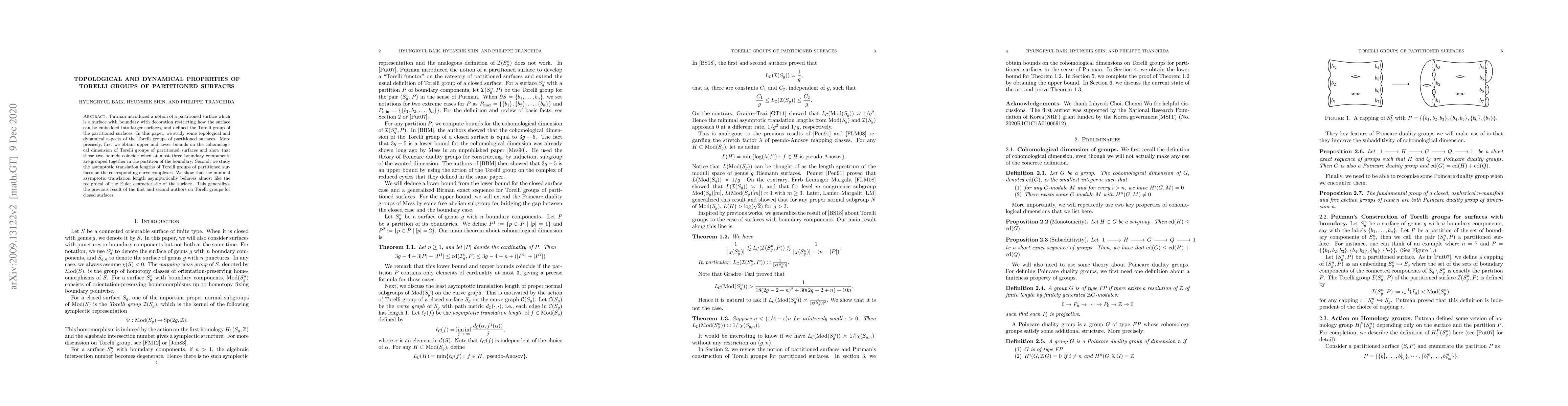 This paper investigates topological and dynamical properties of Torelli groups associated with partitioned surfaces, establishing bounds on their cohomological dimension and analyzing asymptotic translation lengths on curve complexes, showing that the minimal asymptotic translation length relates inversely to the Euler characteristic of the surface.