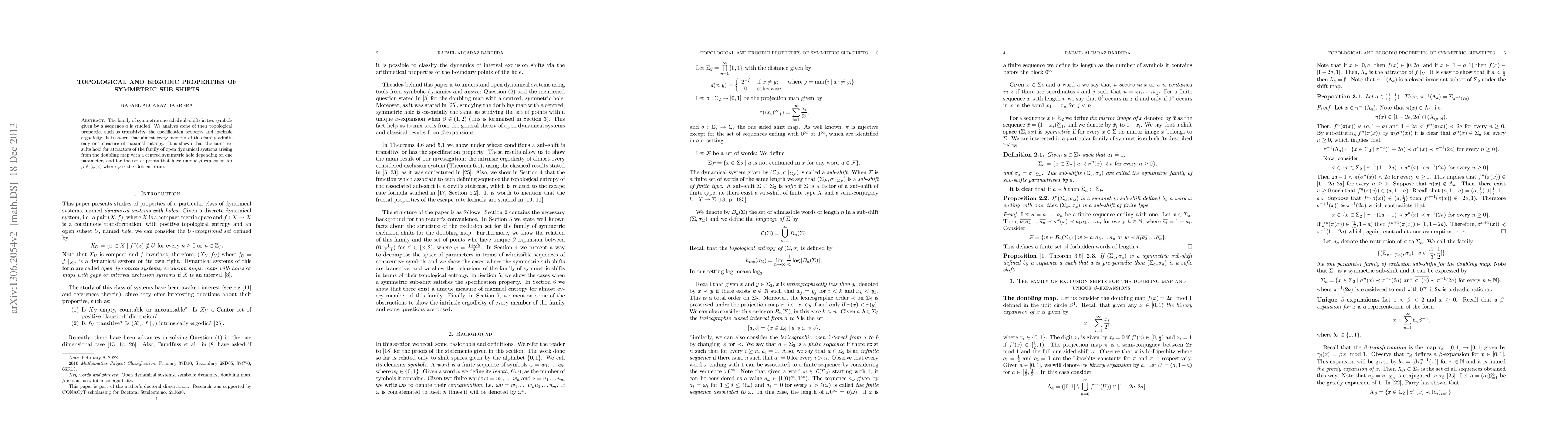 Summary: This paper investigates the topological and ergodic properties of symmetric subshifts in two symbols, demonstrating transitivity, the specification property, and intrinsic ergodicity. It concludes that almost every member of this family has a unique measure of maximal entropy.