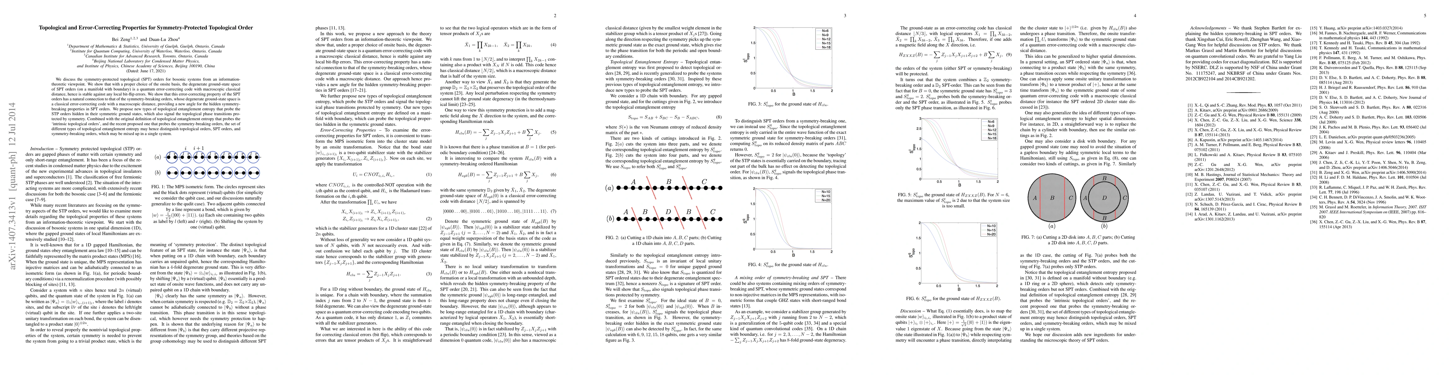 This paper explores symmetry-protected topological (SPT) orders in bosonic systems, demonstrating that their ground-state space functions as a quantum error-correcting code. It connects this error-correcting property to symmetry-breaking orders and proposes new topological entanglement entropy measures to distinguish SPT orders from other topological phases.