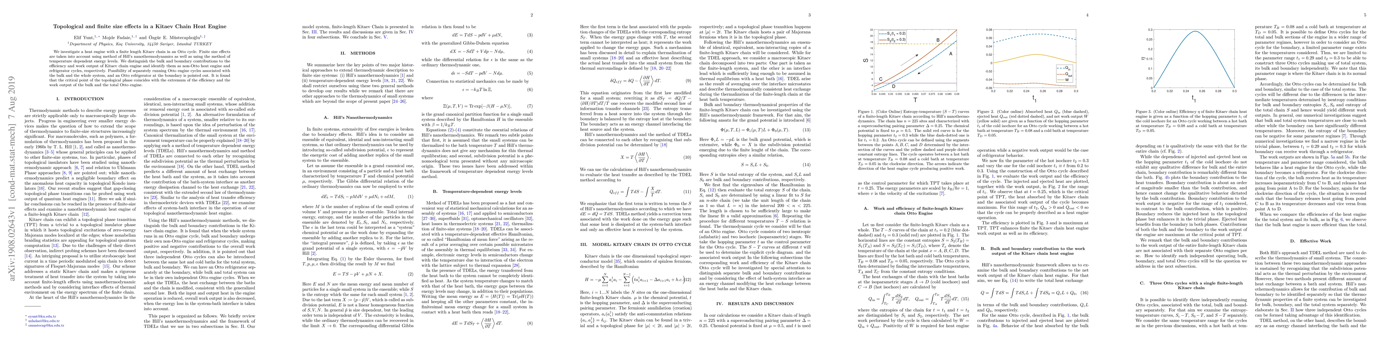 We investigate a heat engine with a finite length Kitaev chain in an Otto cycle. Finite size effects are taken into account using method of Hill's nano-thermodynamics as well as using the method of temperature dependent energy levels. We distinguish the bulk and boundary contributions to the efficiency and the work output of Kitaev chain engine and identify them as non-Otto heat engine and refrigerator cycles, respectively. Possibility of separately running Otto engine cycles associated with the bulk and the whole system, and an Otto refrigerator at the boundary is pointed out. It is found that the critical point of the topological phase coincides with the extremum of the efficiency and the work output of the bulk and the total Otto engine.