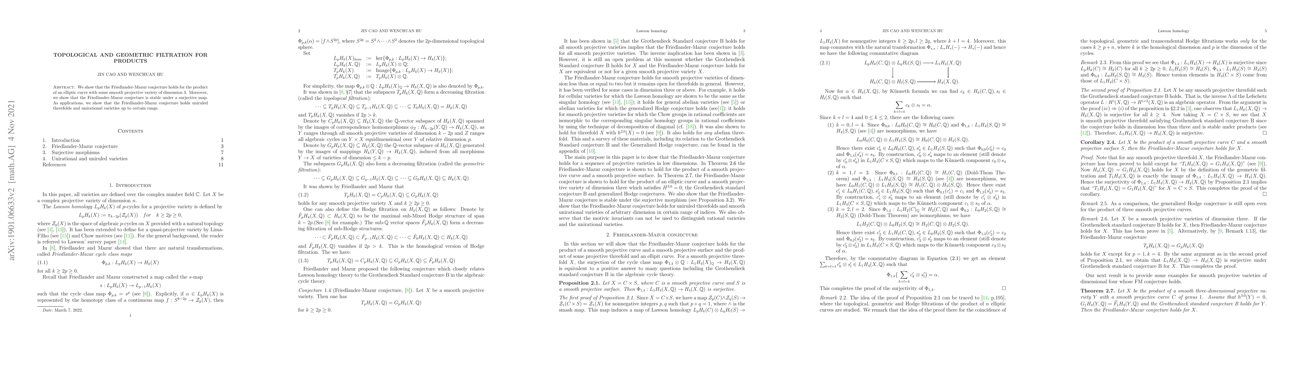 The paper proves the Friedlander-Mazur conjecture for elliptic curve products with certain 3D smooth projective varieties, and demonstrates its stability under surjective maps. This leads to the conjecture's validation for uniruled threefolds and unirational varieties within specific bounds.