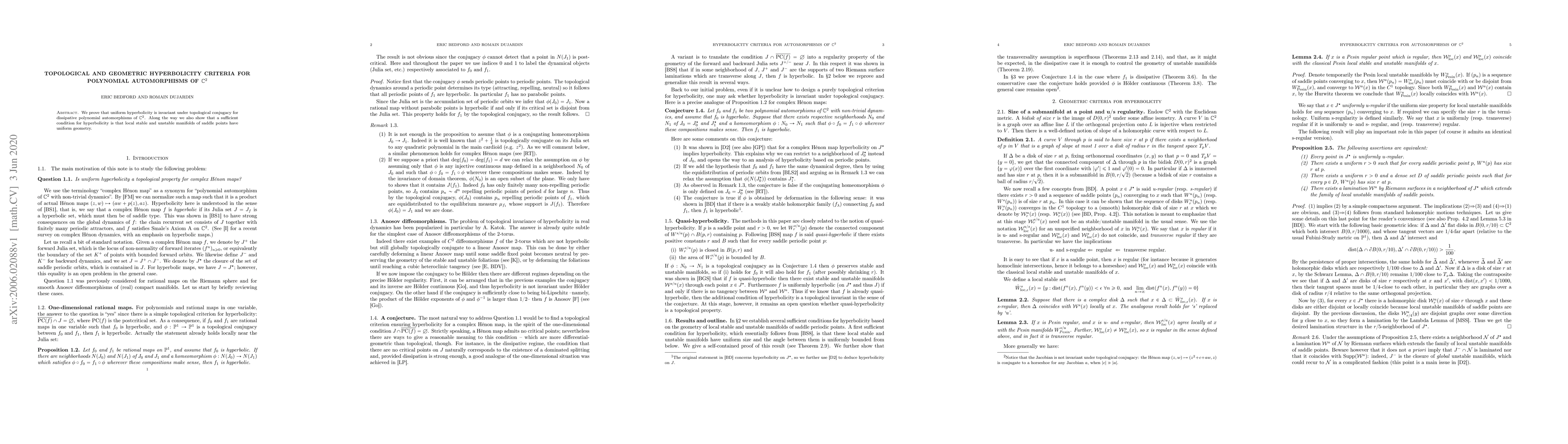 Researchers prove that uniform hyperbolicity is preserved under topological conjugacy in polynomial automorphisms of C^2. They also establish a geometric criterion for hyperbolicity based on the uniform geometry of saddle points' local stable and unstable manifolds.