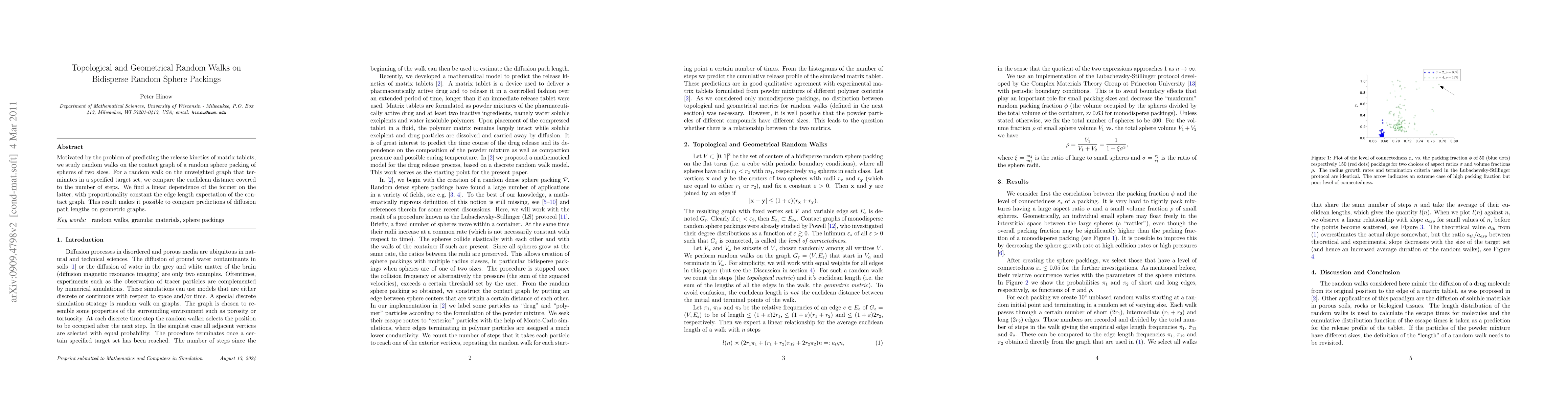 Motivated by a problem arising from pharmaceutical science [B. Baeumer et al., Discr. Contin. Dyn. Sys. B 12], we study random walks on the contact graph of a bidisperse random sphere packing. For a random walk on the unweighted graph that terminates in a specified target set, we compare the number of steps and the total euclidean length of the walk. We find a linear relationship between the two metrics with a proportionality constant that can be calculated from the edge length probabilities of the contact graph.