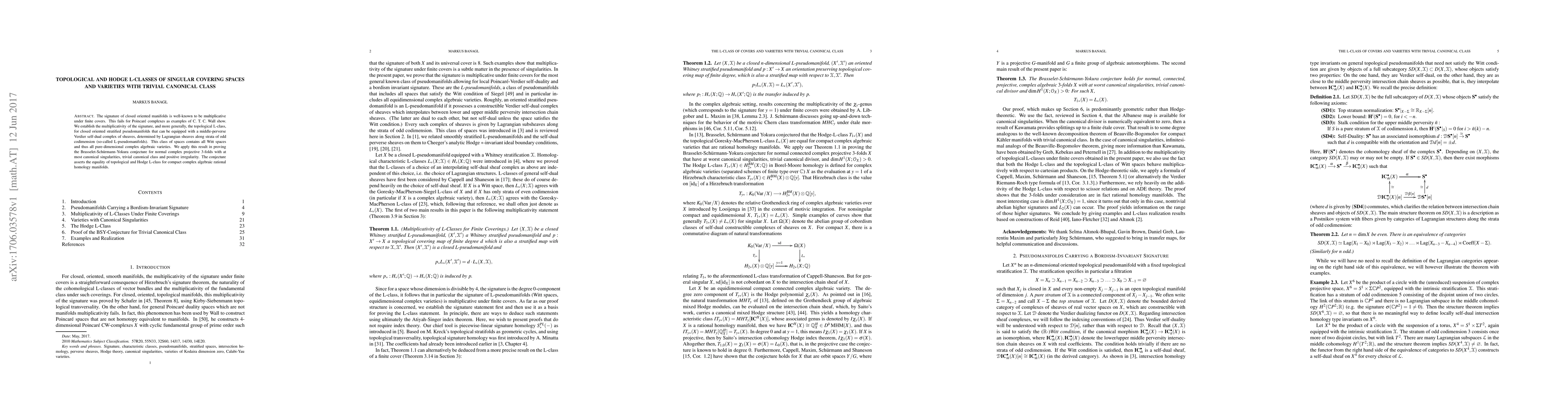 The signature of closed oriented manifolds is well-known to be multiplicative under finite covers. This fails for Poincar\'e complexes as examples of C. T. C. Wall show. We establish the multiplicativity of the signature, and more generally, the topological L-class, for closed oriented stratified pseudomanifolds that can be equipped with a middle-perverse Verdier self-dual complex of sheaves, determined by Lagrangian sheaves along strata of odd codimension (so-called L-pseudomanifolds). This class of spaces contains all Witt spaces and thus all pure-dimensional complex algebraic varieties. We apply this result in proving the Brasselet-Sch\"urmann-Yokura conjecture for normal complex projective 3-folds with at most canonical singularities, trivial canonical class and positive irregularity. The conjecture asserts the equality of topological and Hodge L-class for compact complex algebraic rational homology manifolds.