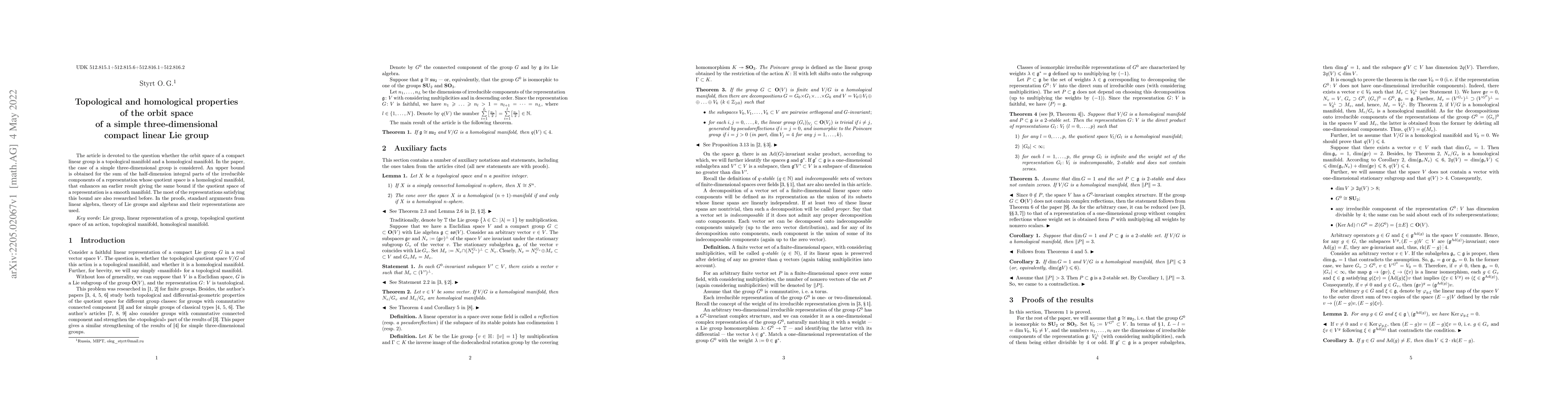 This paper investigates the topological and homological properties of the orbit space of a simple three-dimensional compact linear Lie group, establishing an upper bound for the sum of the half-dimension integral parts of irreducible components in representations whose quotient space is a homological manifold. The results enhance previous findings for smooth manifolds.