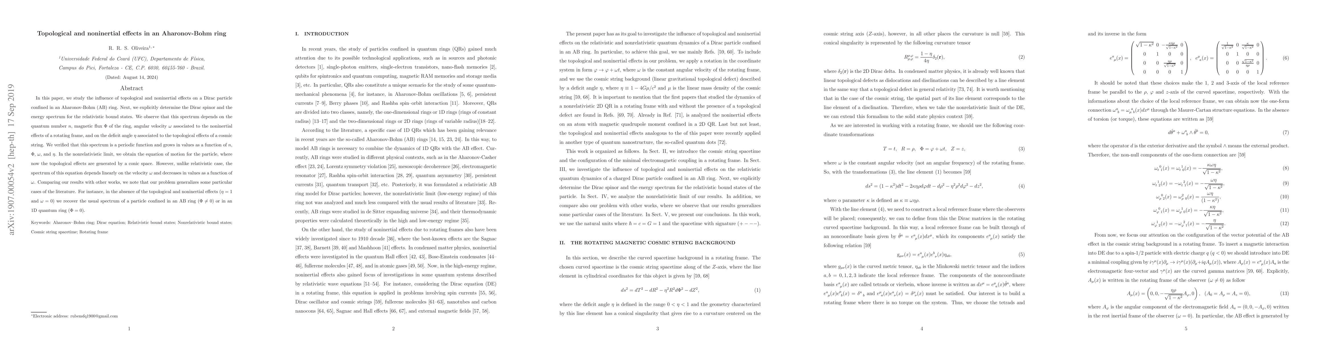 This paper investigates topological and noninertial effects on a Dirac particle in an Aharonov-Bohm ring, determining its energy spectrum which depends on quantum number $n$, magnetic flux $\Phi$, angular velocity $\omega$, and deficit angle $\eta$. In the relativistic case, the spectrum is periodic and grows with $n$, $\Phi$, $\omega$, and $\eta$, while in the nonrelativistic limit, it decreases linearly with $\omega$.