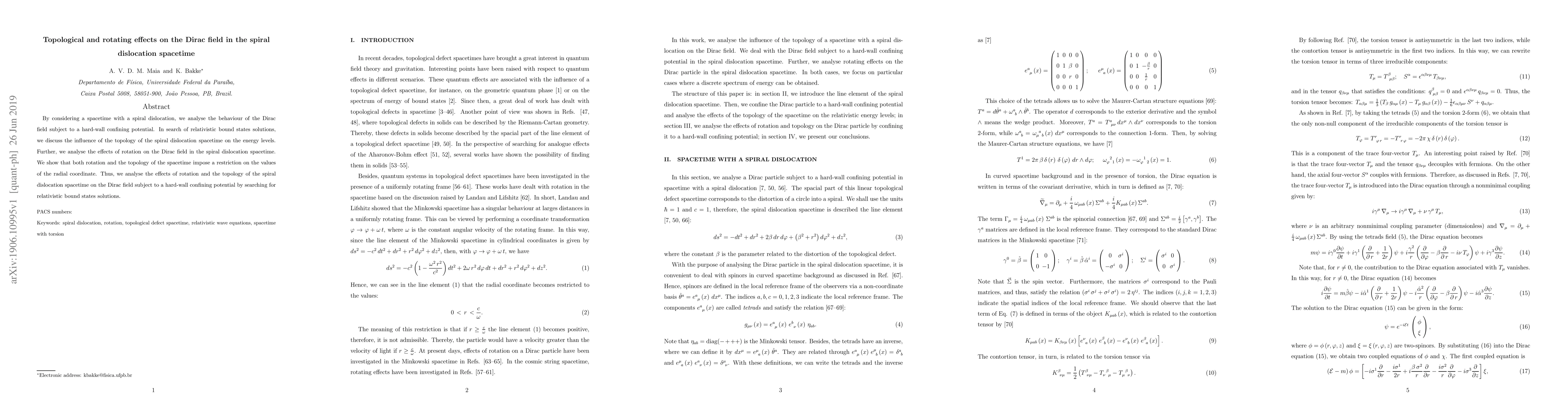 By considering a spacetime with a spiral dislocation, we analyse the behaviour of the Dirac field subject to a hard-wall confining potential. In search of relativistic bound states solutions, we discuss the influence of the topology of the spiral dislocation spacetime on the energy levels. Further, we analyse the effects of rotation on the Dirac field in the spiral dislocation spacetime. We show that both rotation and the topology of the spacetime impose a restriction on the values of the radial coordinate. Thus, we analyse the effects of rotation and the topology of the spiral dislocation spacetime on the Dirac field subject to a hard-wall confining potential by searching for relativistic bound states solutions.