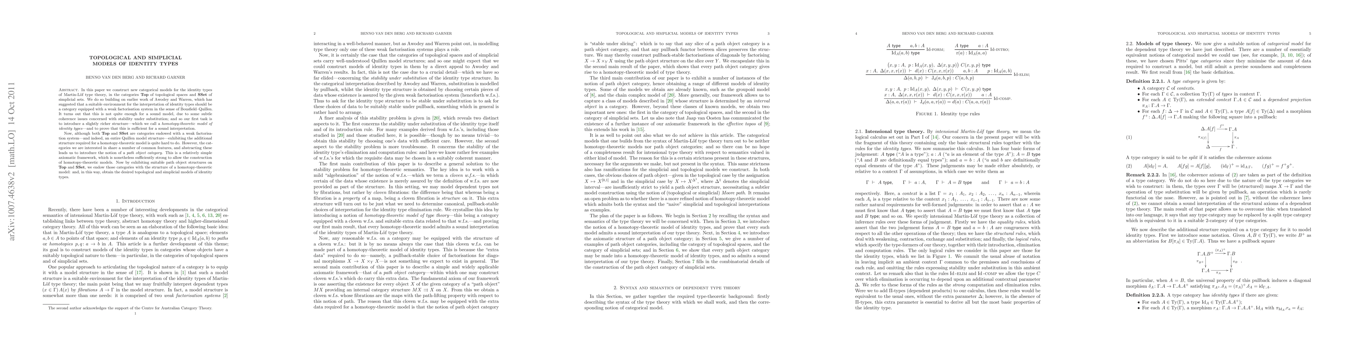 This paper constructs new categorical models for identity types in Martin-Löf type theory within topological spaces (Top) and simplicial sets (SSet), introducing a homotopy-theoretic model to address coherence issues. By establishing path object structures on Top and SSet, the authors achieve sound interpretations of identity types in these categories.