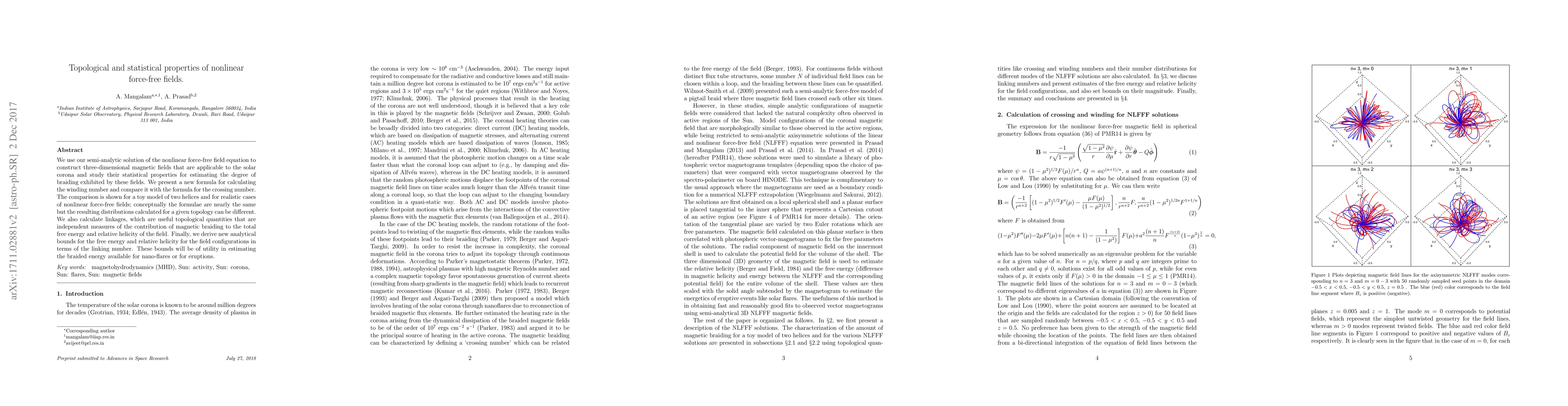 We use our semi-analytic solution of the nonlinear force-free field equation to construct three-dimensional magnetic fields that are applicable to the solar corona and study their statistical properties for estimating the degree of braiding exhibited by these fields. We present a new formula for calculating the winding number and compare it with the formula for the crossing number. The comparison is shown for a toy model of two helices and for realistic cases of nonlinear force-free fields; conceptually the formulae are nearly the same but the resulting distributions calculated for a given topology can be different. We also calculate linkages, which are useful topological quantities that are independent measures of the contribution of magnetic braiding to the total free energy and relative helicity of the field. Finally, we derive new analytical bounds for the free energy and relative helicity for the field configurations in terms of the linking number. These bounds will be of utility in estimating the braided energy available for nano-flares or for eruptions.