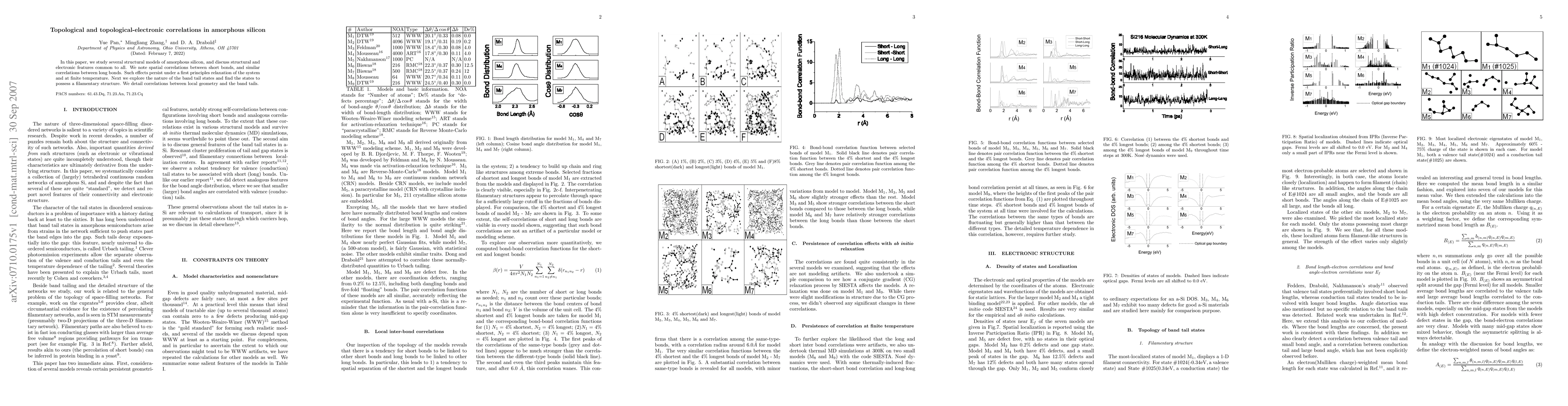 This paper investigates structural and electronic features in amorphous silicon, noting persistent correlations between short and long bonds even after relaxation and temperature effects. It also explores band tail states, revealing a filamentary structure and linking these states to local geometry.