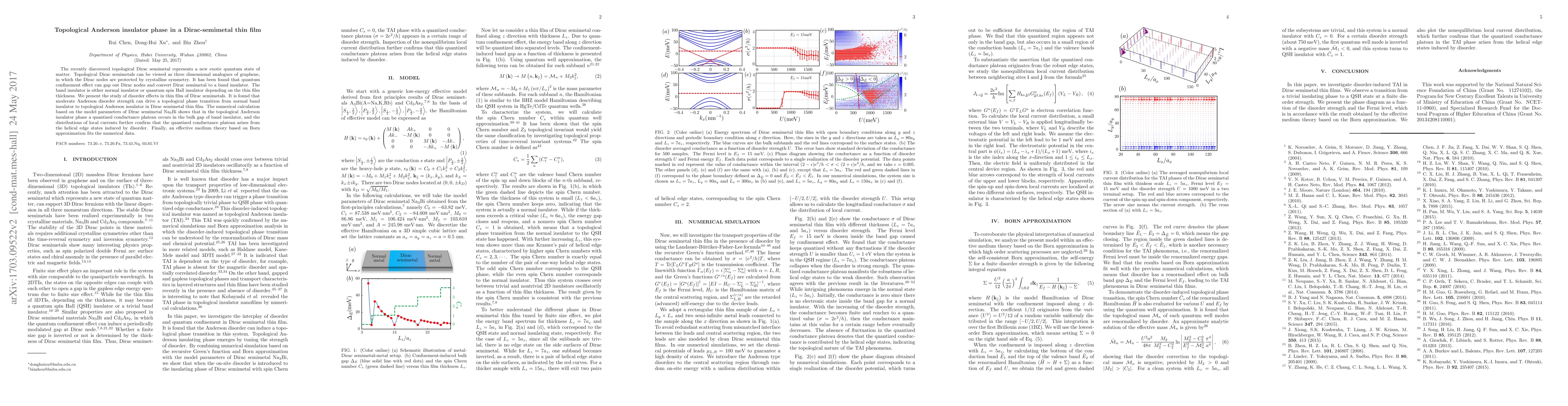 The study investigates how moderate Anderson disorder in a thin film of topological Dirac semimetals can induce a topological phase transition, leading to a topological Anderson insulator phase characterized by quantized conductance plateaus due to helical edge states. Numerical simulations on Na$_3$Bi confirm these findings and are well-fit by an effective medium theory using the Born approximation.