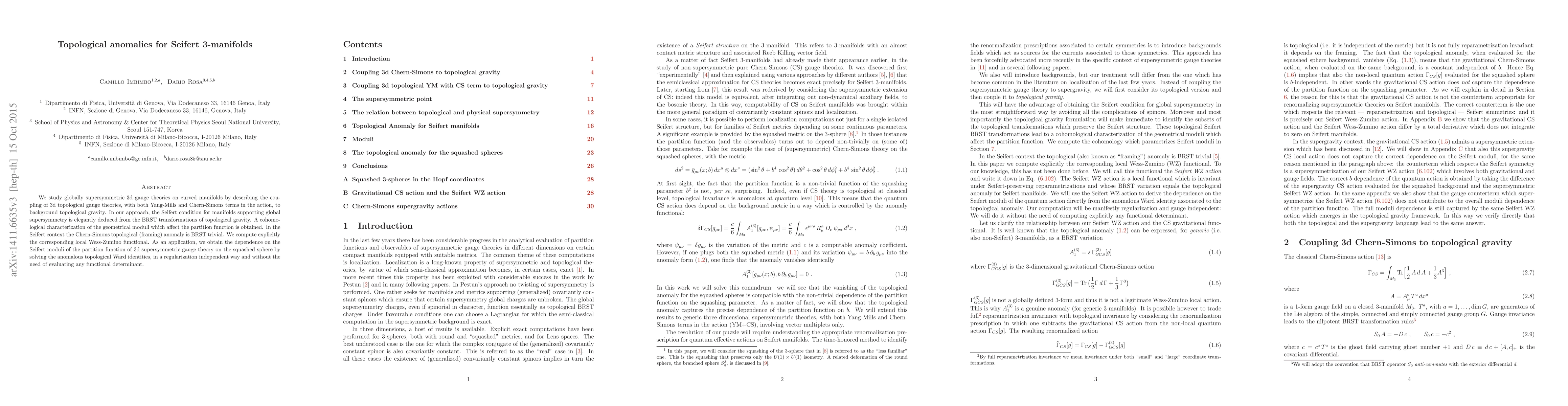 We study globally supersymmetric 3d gauge theories on curved manifolds by describing the coupling of 3d topological gauge theories, with both Yang-Mills and Chern-Simons terms in the action, to background topological gravity. In our approach the Seifert condition for manifolds supporting global supersymmetry is elegantly deduced from the topological gravity BRST transformations. A cohomological characterization of the geometrical moduli which affect the partition function is obtained. In the Seifert context Chern-Simons topological (framing) anomaly is BRST trivial. We compute explicitly the corresponding local Wess-Zumino functional. As an application, we obtain the dependence on the Seifert moduli of the partition function of 3d supersymmetric gauge theory on the squashed sphere by solving the anomalous topological Ward identities, in a regularization independent way and without the need of evaluating any functional determinant.