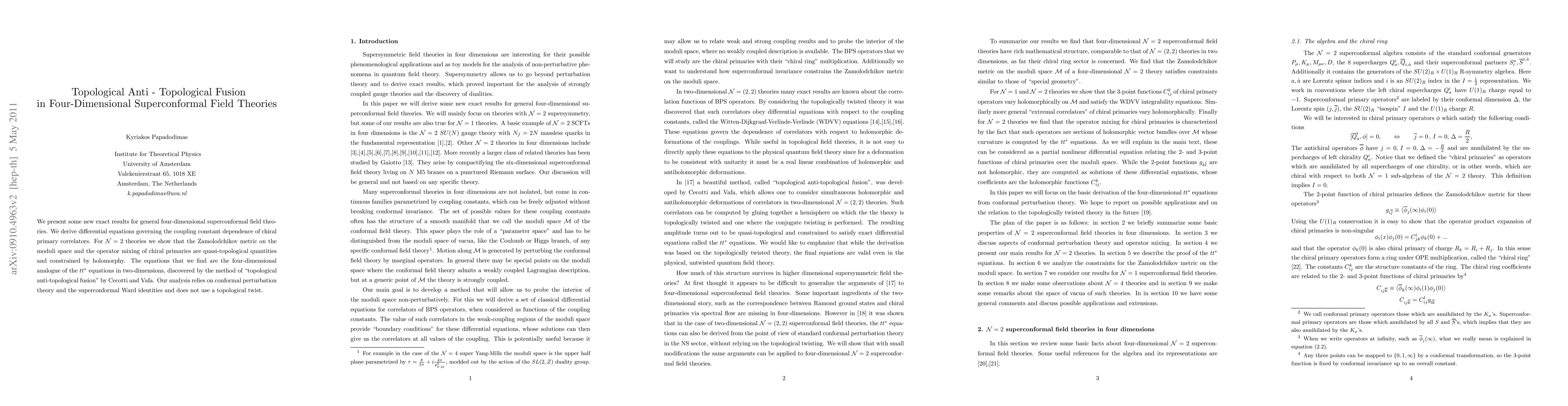 This paper presents new exact results for four-dimensional superconformal field theories, deriving differential equations for chiral primary correlators. It shows that the Zamolodchikov metric and operator mixing in N=2 theories are quasi-topological and constrained by holomorphy, analogous to the tt* equations in two dimensions via "topological anti-topological fusion."