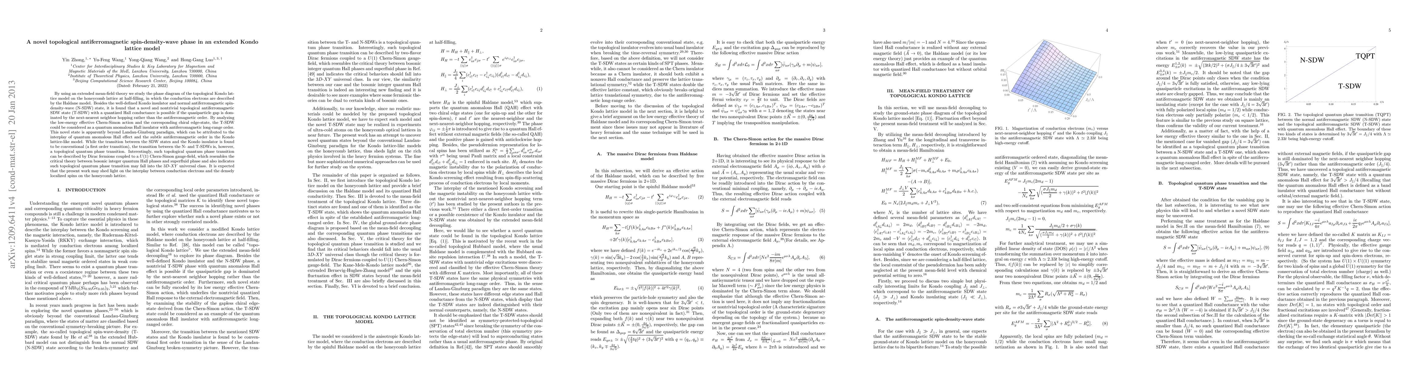 This study reveals the existence of a topological antiferromagnetic spin-density-wave (T-SDW) phase in a Kondo lattice model on a honeycomb lattice, characterized by a quantized Hall conductance and a topological quantum phase transition. The T-SDW emerges when the quasiparticle gap is dominated by next-nearest-neighbor hopping, distinguishing it from conventional antiferromagnetic states.