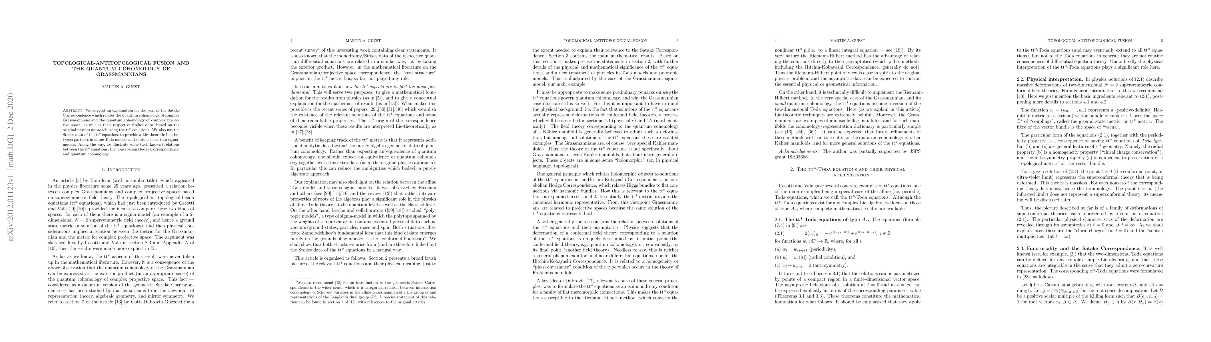 This paper explains the Satake Correspondence linking the quantum cohomology of Grassmannians and projective spaces using tt* equations, and draws connections between affine Toda model particles and sigma-model solitons through Stokes data. It also highlights relationships between the tt* equations, non-abelian Hodge Correspondence, and quantum cohomology.