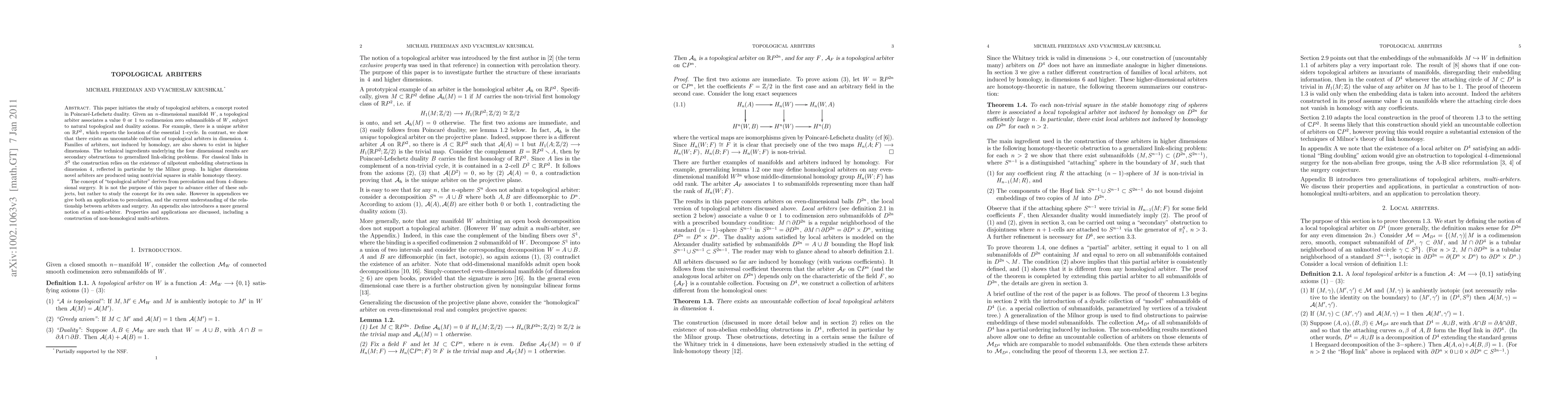 This paper initiates the study of topological arbiters, a concept rooted in Poincare-Lefschetz duality. Given an n-dimensional manifold W, a topological arbiter associates a value 0 or 1 to codimension zero submanifolds of W, subject to natural topological and duality axioms. For example, there is a unique arbiter on $RP^2$, which reports the location of the essential 1-cycle. In contrast, we show that there exists an uncountable collection of topological arbiters in dimension 4. Families of arbiters, not induced by homology, are also shown to exist in higher dimensions. The technical ingredients underlying the four dimensional results are secondary obstructions to generalized link-slicing problems. For classical links in the 3-sphere the construction relies on the existence of nilpotent embedding obstructions in dimension 4, reflected in particular by the Milnor group. In higher dimensions novel arbiters are produced using nontrivial squares in stable homotopy theory. The concept of "topological arbiter" derives from percolation and from 4-dimensional surgery. It is not the purpose of this paper to advance either of these subjects, but rather to study the concept for its own sake. However in appendices we give both an application to percolation, and the current understanding of the relationship between arbiters and surgery. An appendix also introduces a more general notion of a multi-arbiter. Properties and applications are discussed, including a construction of non-homological multi-arbiters.