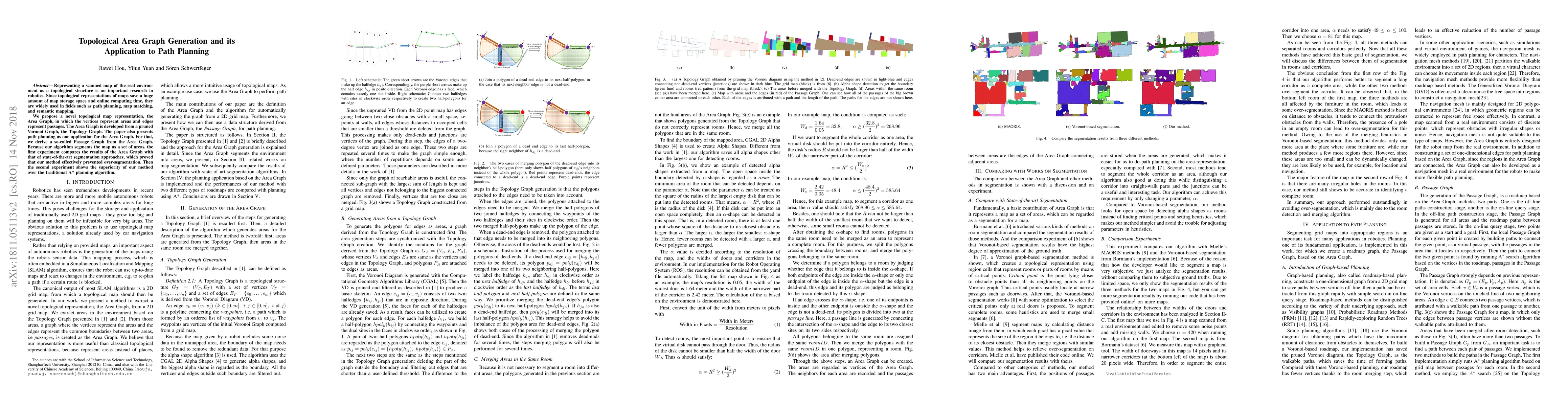 The paper introduces the Area Graph, a novel topological map representation using areas and passages, derived from a pruned Voronoi Graph. Experiments demonstrate its effectiveness in preventing over-segmentation and superior performance compared to traditional A* planning algorithms for path planning in robotics.