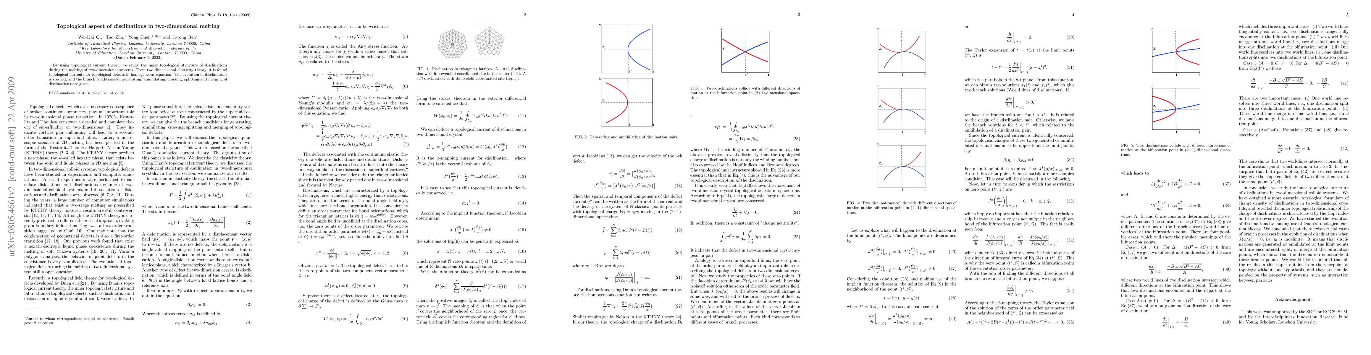 By using topological current theory, we study the inner topological structure of disclinations during the melting of two-dimensional systems. From two-dimensional elasticity theory, it is found topological currents for topological defects in homogeneous equation. The evolution of disclinations is studied, and the branch conditions for generating, annihilating, crossing, splitting, and merging of disclinations are given.