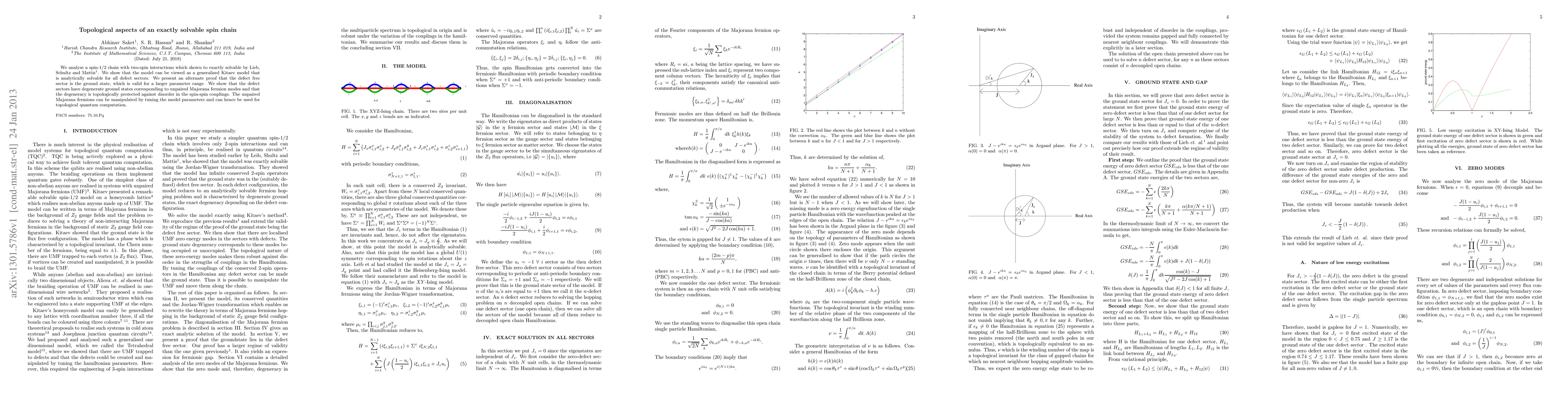 We analyse a spin-1/2 chain with two-spin interactions which shown to exactly solvable by Lieb, Schultz and Mattis. We show that the model can be viewed as a generalised Kitaev model that is analytically solvable for all defect sectors. We present an alternate proof that the defect free sector is the ground state, which is valid for a larger parameter range. We show that the defect sectors have degenerate ground states corresponding to unpaired Majorana fermion modes and that the degeneracy is topologically protected against disorder in the spin-spin couplings. The unpaired Majorana fermions can be manipulated by tuning the model parameters and can hence be used for topological quantum computation.