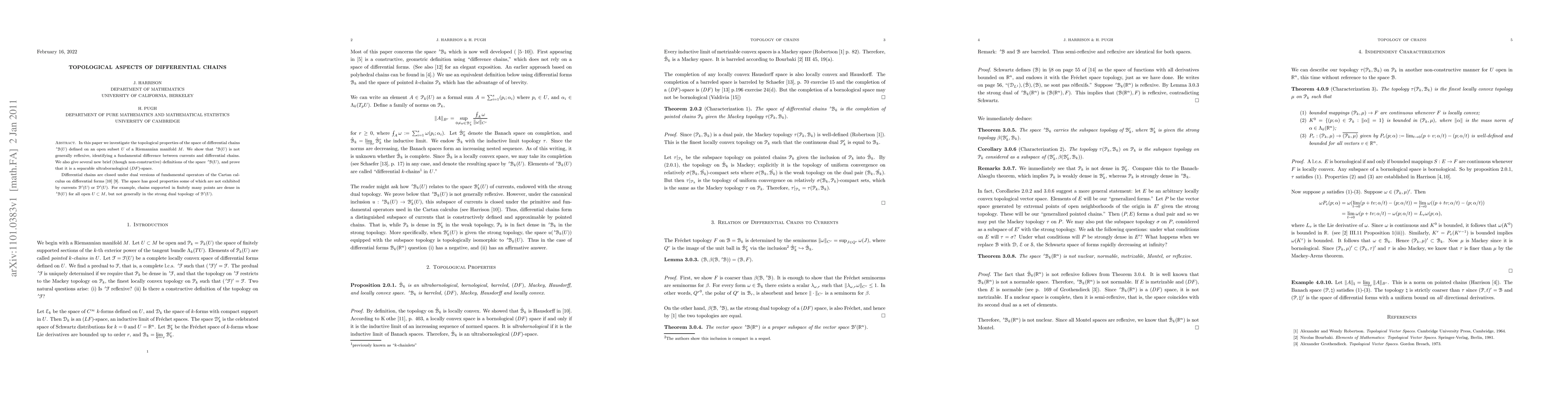 In this paper we investigate the topological properties of the space of differential chains 'B(U) defined on an open subset U of a Riemannian manifold M. We show that 'B(U) is not generally reflexive, identifying a fundamental difference between currents and differential chains. We also give several new brief (though non-constructive) definitions of the space 'B(U), and prove that it is a separable ultrabornological (DF)-space. Differential chains are closed under dual versions of fundamental operators of the Cartan calculus on differential forms. The space has good properties some of which are not exhibited by currents B'(U) or D'(U). For example, chains supported in finitely many points are dense in 'B(U) for all open U in M, but not generally in the strong dual topology of B'(U).
