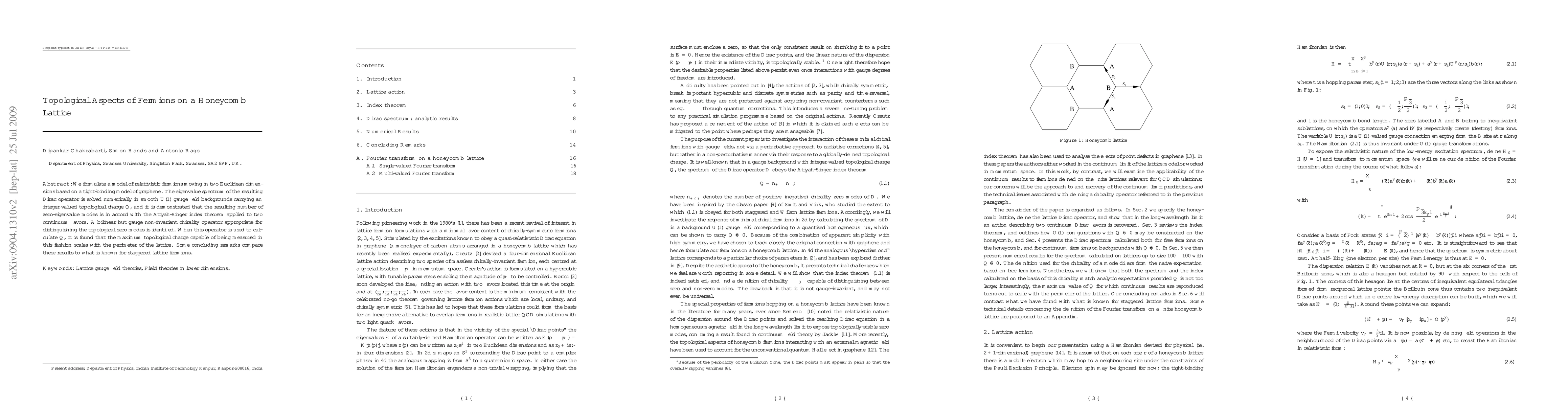 This paper formulates a relativistic fermion model on a honeycomb lattice, demonstrating the agreement between the number of zero-eigenvalue modes of the Dirac operator and the Atiyah-Singer index theorem. The topological charge Q is shown to scale with the lattice perimeter, and comparisons are made to staggered lattice fermions.