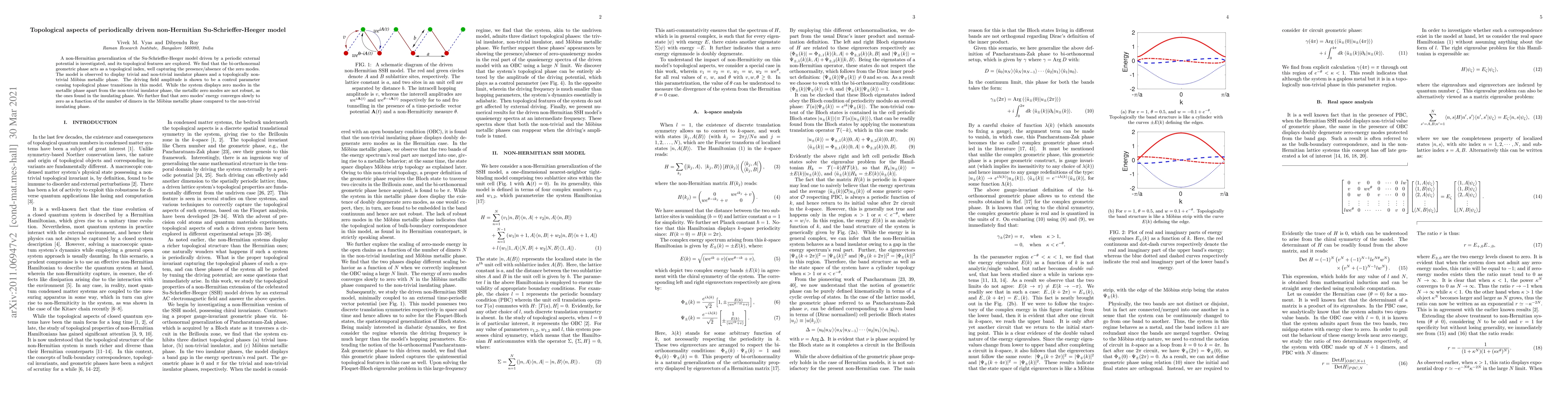 A non-Hermitian generalization of the Su-Schrieffer-Heeger model driven by a periodic external potential is investigated, and its topological features are explored. We find that the bi-orthonormal geometric phase acts as a topological index, well capturing the presence/absence of the zero modes. The model is observed to display trivial and non-trivial insulator phases and a topologically non-trivial M${\"o}$bius metallic phase. The driving field amplitude is shown to be a control parameter causing topological phase transitions in this model. While the system displays zero modes in the metallic phase apart from the non-trivial insulator phase, the metallic zero modes are not robust, as the ones found in the insulating phase. We further find that zero modes' energy converges slowly to zero as a function of the number of dimers in the M${\"o}$bius metallic phase compared to the non-trivial insulating phase.