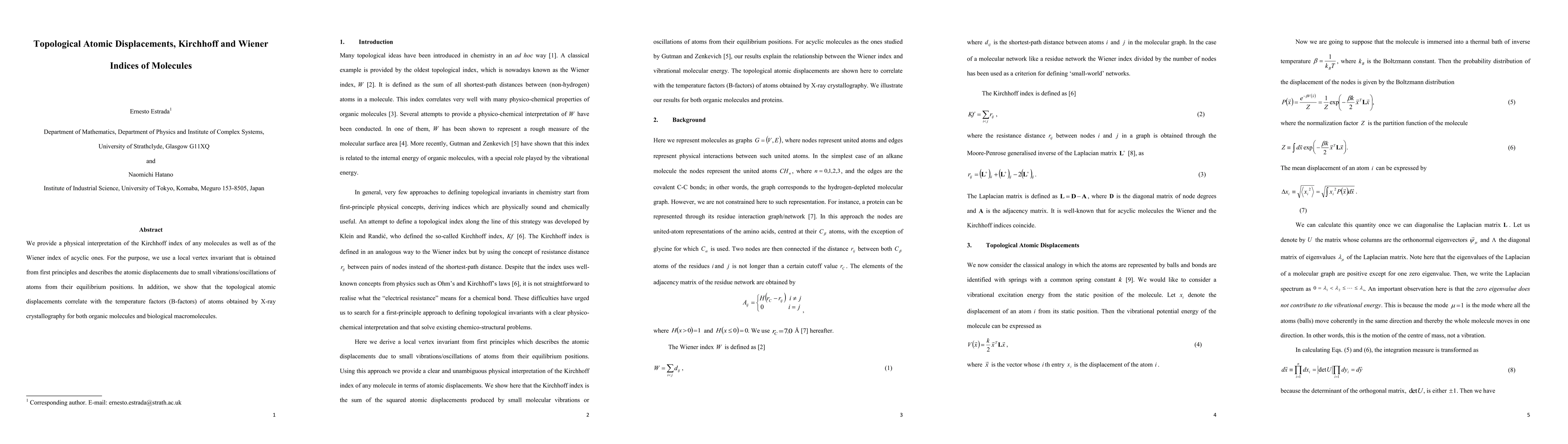This paper interprets the Kirchhoff index for molecules and the Wiener index for acyclic molecules using a local vertex invariant derived from atomic displacements due to small vibrations. It also demonstrates a correlation between these topological atomic displacements and temperature factors (B-factors) from X-ray crystallography for both organic and biological macromolecules.