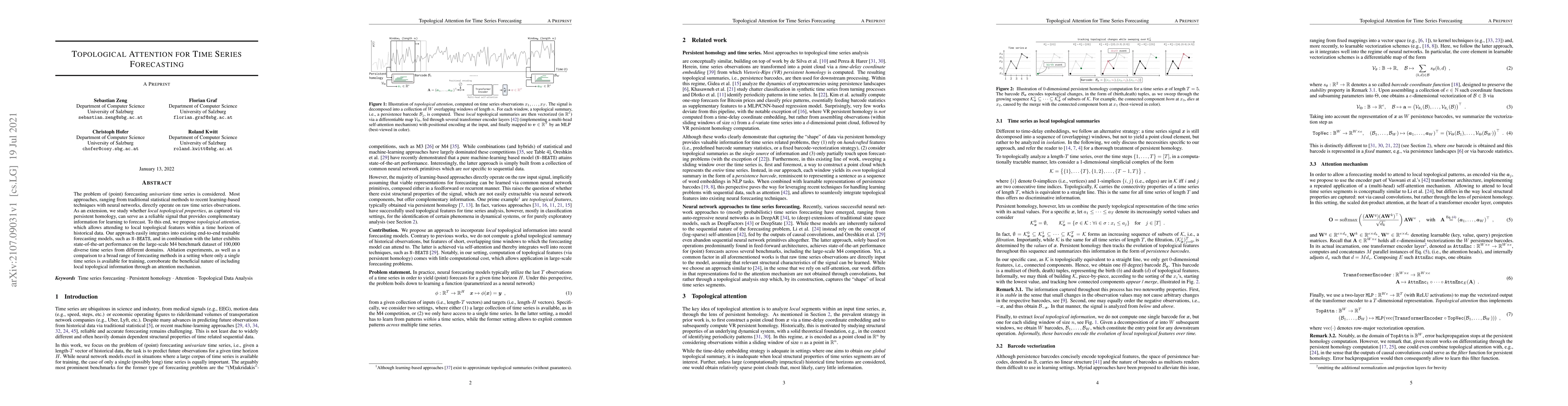This paper proposes "topological attention" to incorporate local topological features, captured via persistent homology, into time series forecasting models like N-BEATS, achieving state-of-the-art performance on the M4 benchmark dataset. The integration of topological information enhances forecasting accuracy, as demonstrated through ablation experiments and comparisons.