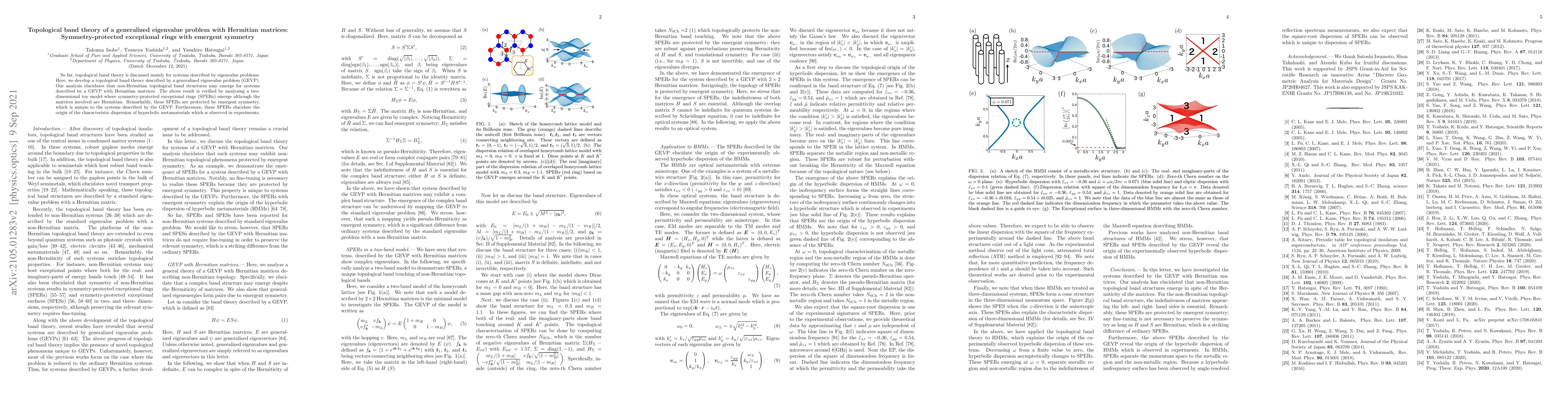 This paper develops a topological band theory for generalized eigenvalue problems (GEVP) with Hermitian matrices, revealing non-Hermitian topological structures. It identifies symmetry-protected exceptional rings (SPERs) in a 2D model, protected by emergent symmetry, explaining the dispersion in hyperbolic metamaterials.