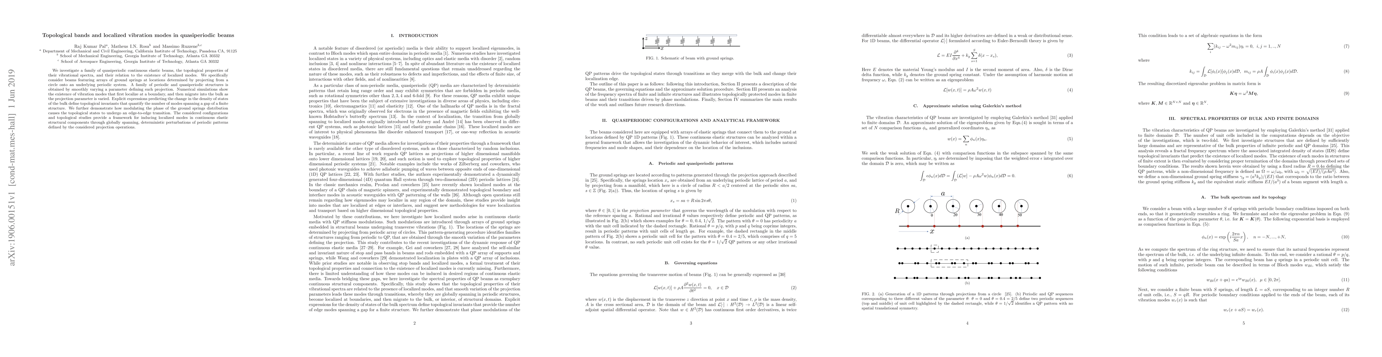 We investigate a family of quasiperiodic continuous elastic beams, the topological properties of their vibrational spectra, and their relation to the existence of localized modes. We specifically consider beams featuring arrays of ground springs at locations determined by projecting from a circle onto an underlying periodic system. A family of periodic and quasiperiodic structures is obtained by smoothly varying a parameter defining such projection. Numerical simulations show the existence of vibration modes that first localize at a boundary, and then migrate into the bulk as the projection parameter is varied. Explicit expressions predicting the change in the density of states of the bulk define topological invariants that quantify the number of modes spanning a gap of a finite structure. We further demonstrate how modulating the phase of the ground springs distribution causes the topological states to undergo an edge-to-edge transition. The considered configurations and topological studies provide a framework for inducing localized modes in continuous elastic structural components through globally spanning, deterministic perturbations of periodic patterns defined by the considered projection operations.