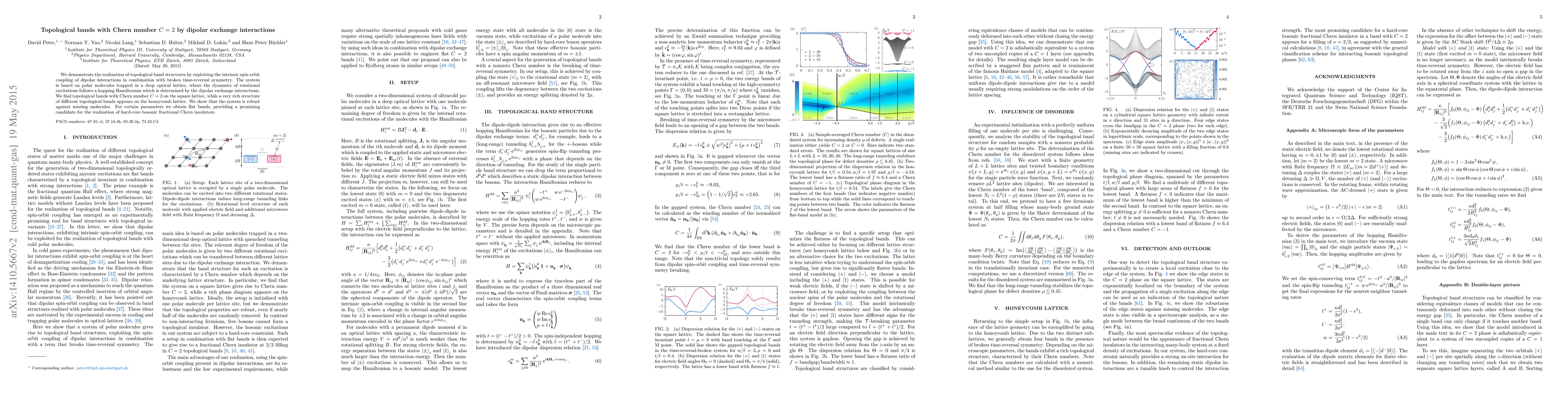 We demonstrate the realization of topological band structures by exploiting the intrinsic spin-orbit coupling of dipolar interactions in combination with broken time-reversal symmetry. The system is based on polar molecules trapped in a deep optical lattice, where the dynamics of rotational excitations follows a hopping Hamiltonian which is determined by the dipolar exchange interactions. We find topological bands with Chern number $C=2$ on the square lattice, while a very rich structure of different topological bands appears on the honeycomb lattice. We show that the system is robust against missing molecules. For certain parameters we obtain flat bands, providing a promising candidate for the realization of hard-core bosonic fractional Chern insulators.