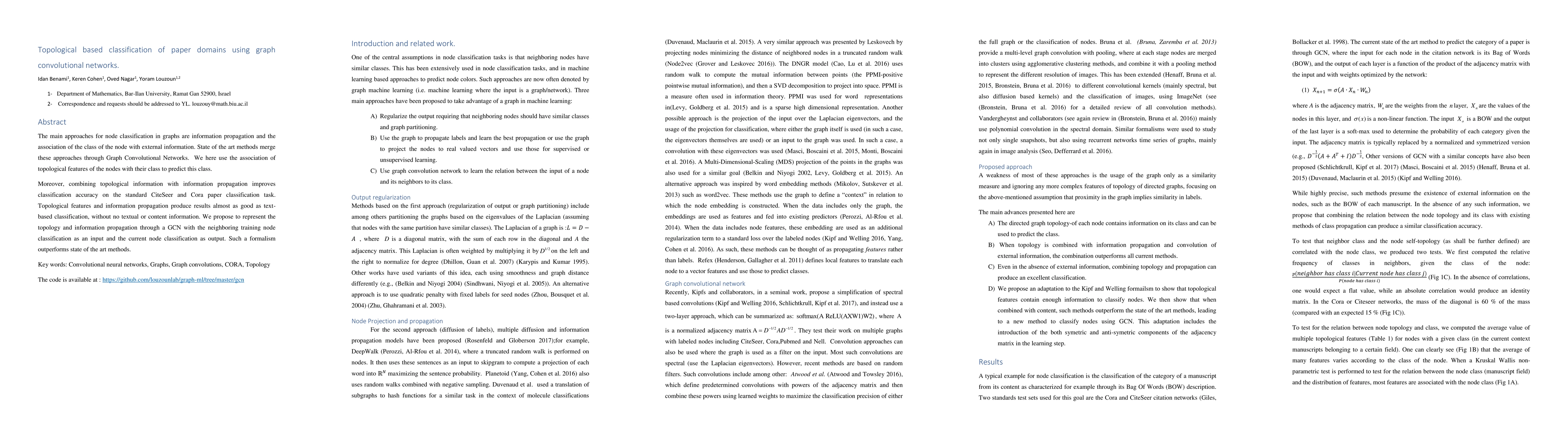 The main approaches for node classification in graphs are information propagation and the association of the class of the node with external information. State of the art methods merge these approaches through Graph Convolutional Networks. We here use the association of topological features of the nodes with their class to predict this class. Moreover, combining topological information with information propagation improves classification accuracy on the standard CiteSeer and Cora paper classification task. Topological features and information propagation produce results almost as good as text-based classification, without no textual or content information. We propose to represent the topology and information propagation through a GCN with the neighboring training node classification as an input and the current node classification as output. Such a formalism outperforms state of the art methods.