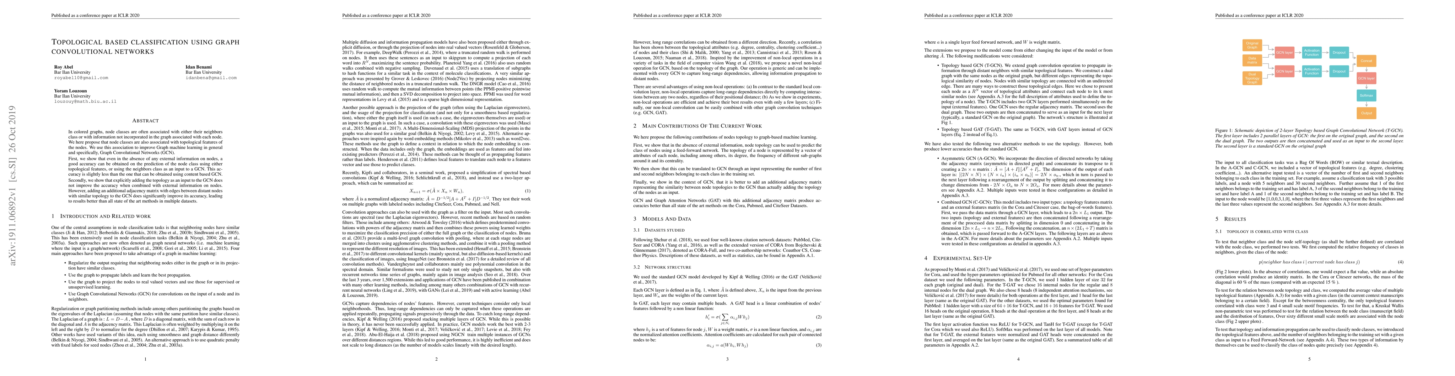 In colored graphs, node classes are often associated with either their neighbors class or with information not incorporated in the graph associated with each node. We here propose that node classes are also associated with topological features of the nodes. We use this association to improve Graph machine learning in general and specifically, Graph Convolutional Networks (GCN). First, we show that even in the absence of any external information on nodes, a good accuracy can be obtained on the prediction of the node class using either topological features, or using the neighbors class as an input to a GCN. This accuracy is slightly less than the one that can be obtained using content based GCN. Secondly, we show that explicitly adding the topology as an input to the GCN does not improve the accuracy when combined with external information on nodes. However, adding an additional adjacency matrix with edges between distant nodes with similar topology to the GCN does significantly improve its accuracy, leading to results better than all state of the art methods in multiple datasets.