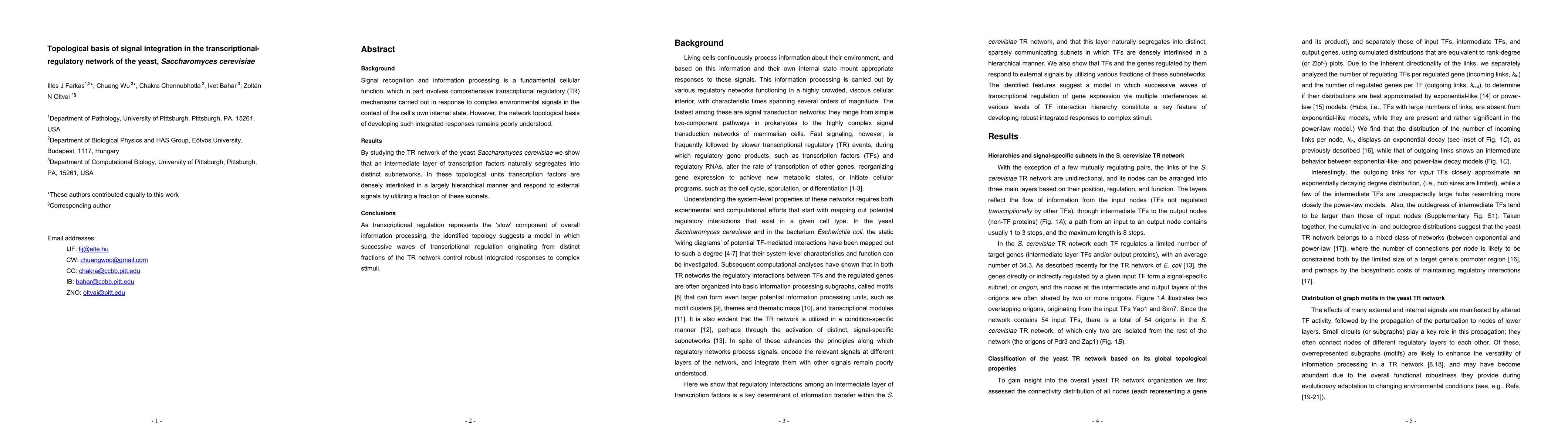 This study reveals that the transcriptional regulatory network of Saccharomyces cerevisiae is organized into distinct, densely interlinked subnetworks, which hierarchically respond to external signals. The identified topological basis suggests a model where successive waves of regulation from different network fractions enable robust integrated responses to complex stimuli.