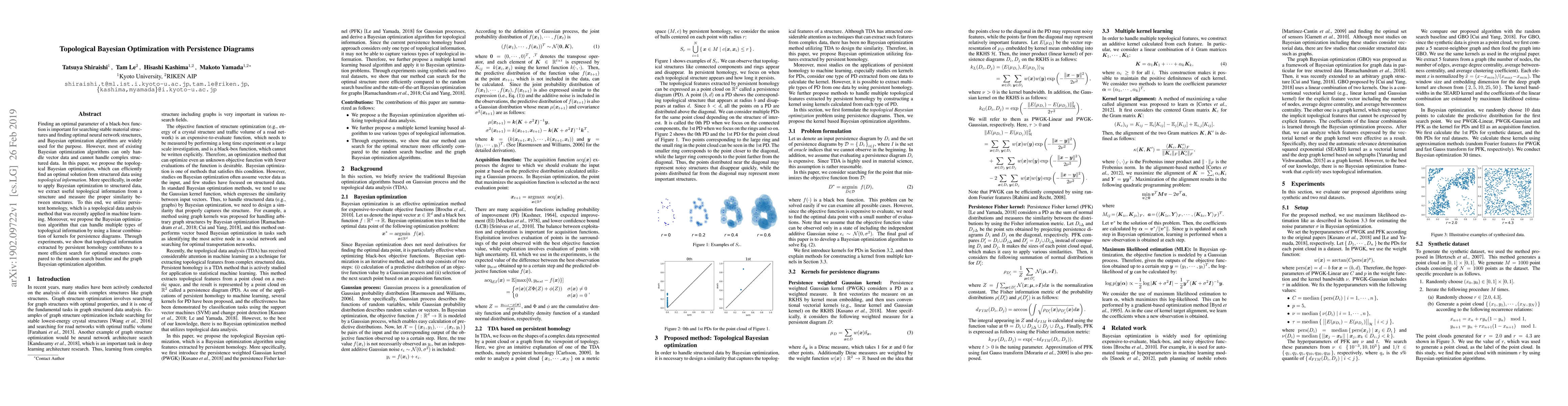 This paper proposes topological Bayesian optimization using persistence diagrams to efficiently find optimal solutions for structured data, leveraging topological information from persistent homology. The method combines kernels for persistence diagrams to handle multiple types of topological information, demonstrating improved efficiency over random search and graph Bayesian optimization in experiments.