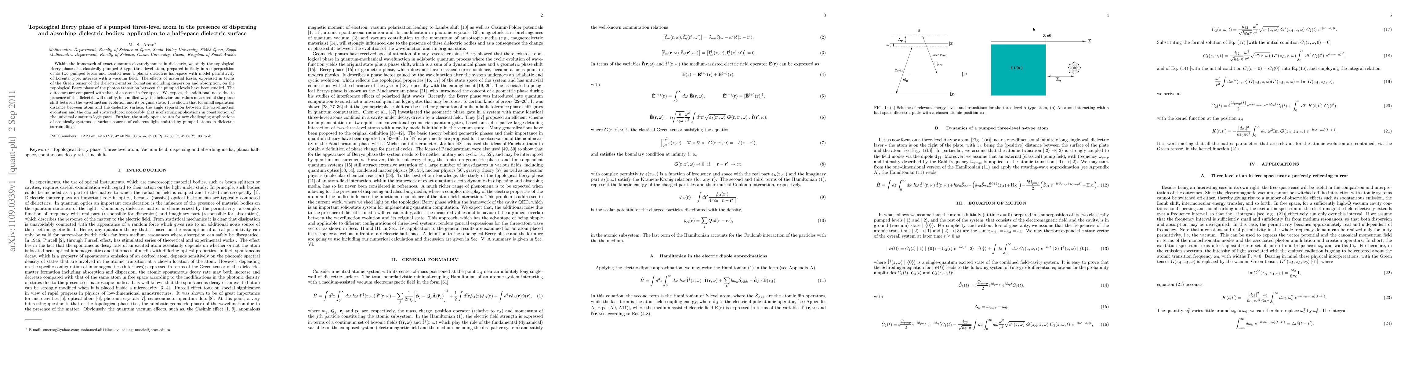 This paper investigates the topological Berry phase of a pumped three-level atom near a dielectric half-space, considering material losses due to dispersion and absorption. The study reveals that the presence of the dielectric significantly alters the phase shift, potentially enhancing applications in quantum logic gates and coherent light sources.