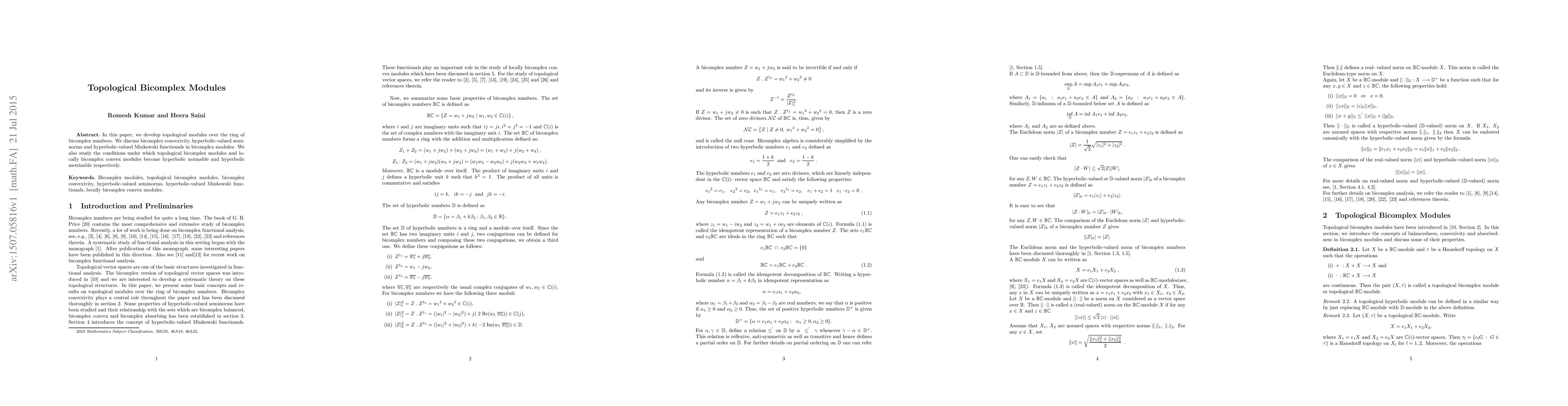 In this paper, we develop topological modules over the ring of bicomplex numbers. We discuss bicomplex convexivity, hyperbolic-valued seminorms and hyperbolic-valued Minkowski functionals in bicomplex modules. We also study the conditions under which topological bicomplex modules and locally bicomplex convex modules become hyperbolic normable and hyperbolic metrizable respectively.